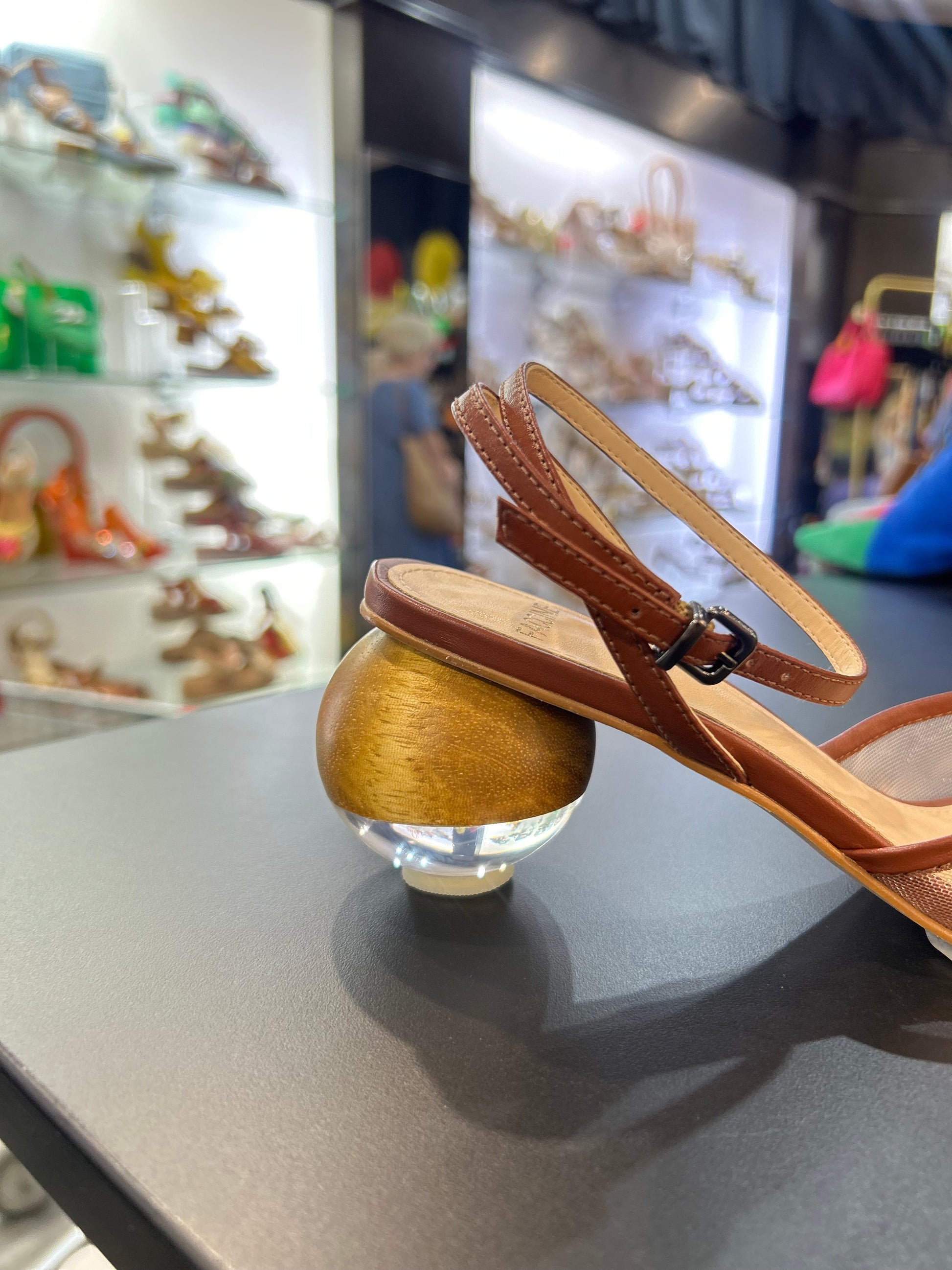 Another stunning creation from Faccine Brazil – refined, elegant and truly unique. The softly shaped toe and delicate mesh upper create a light, graceful look, while the real showstopper is the sphere-shaped translucent heel, half wrapped in a rich wooden veneer. A divine design made for special occasions, this is sophistication with a twist you won’t find everywhere.