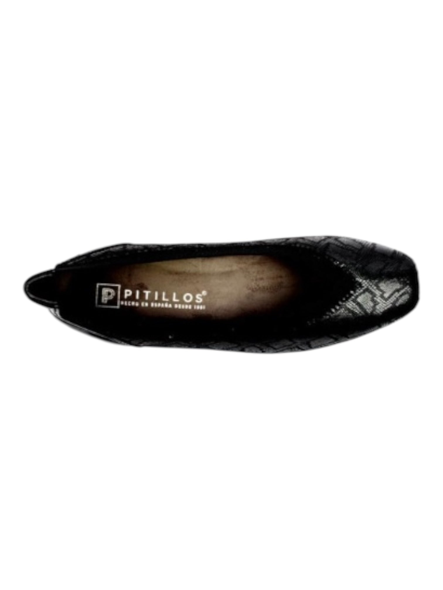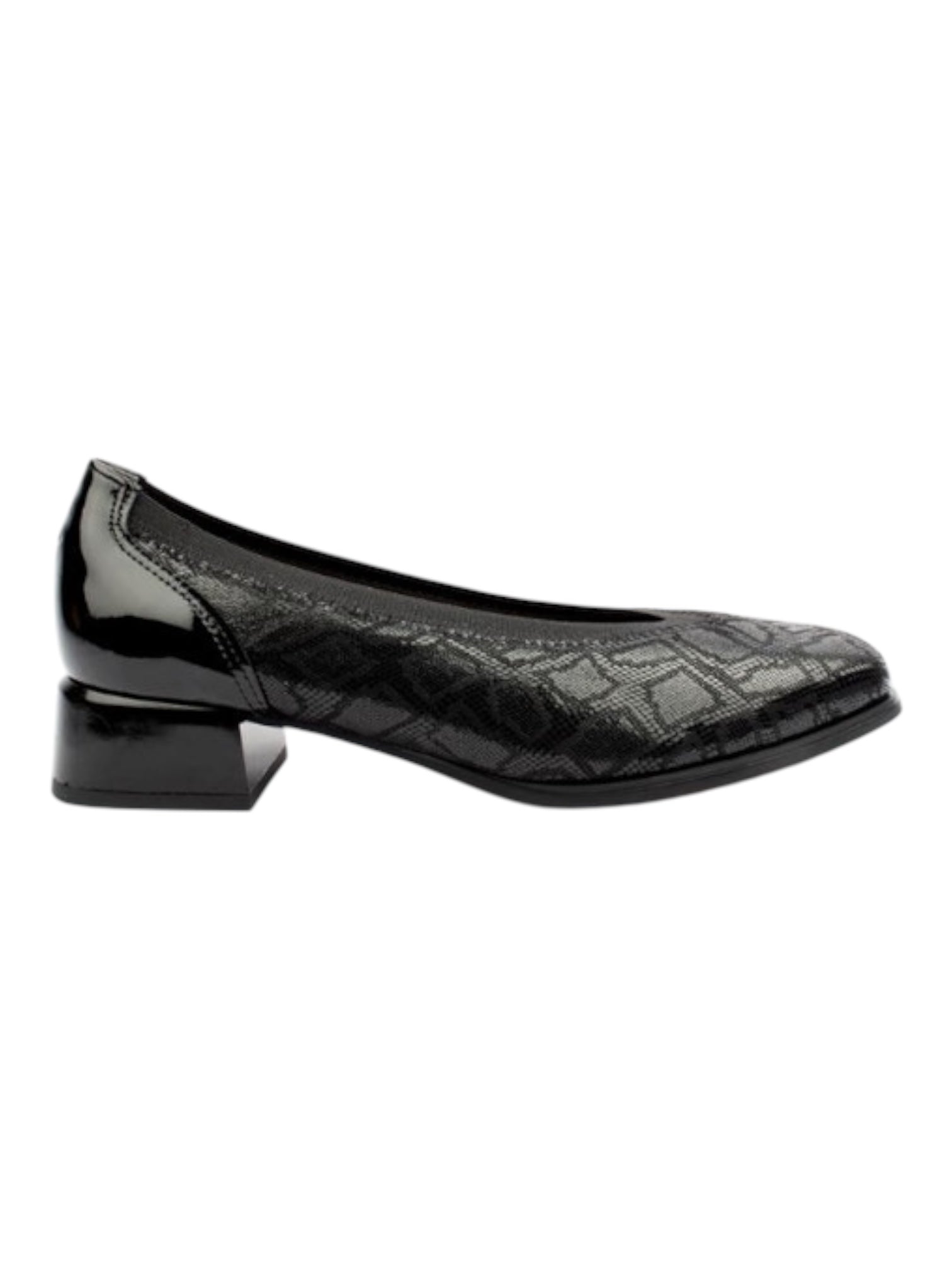 The Pitillos Ladies' Dressy Pumps offer a refined and stylish addition to any wardrobe. Crafted with a black stretch leather patterned upper, these slip-on shoes feature an elasticized rim for a secure and comfortable fit. The square toe design adds a modern touch, while the black patent low block heel provides subtle elevation and all-day comfort. With a height of 3.5cm, these pumps are ideal for both professional and formal settings. Made with a leather upper, textile lining, and a durable manmade outsole, they combine quality craftsmanship with timeless style. Available in classic black, these pumps are a versatile and sophisticated choice.