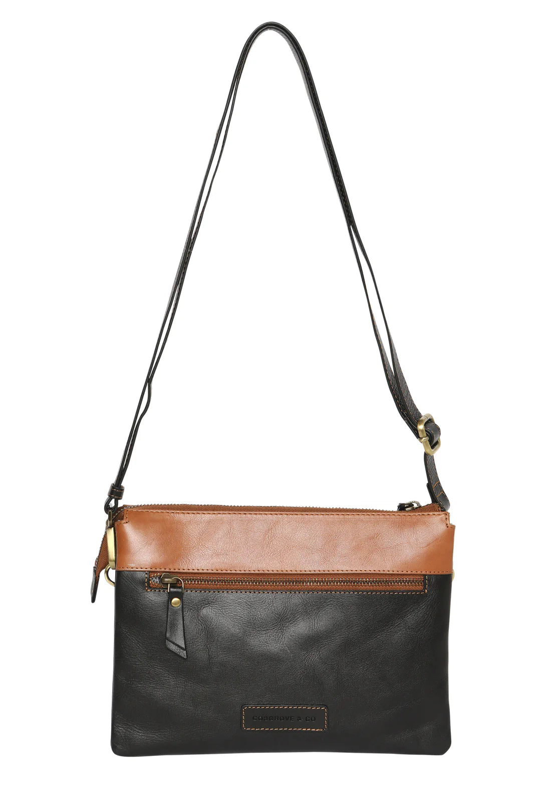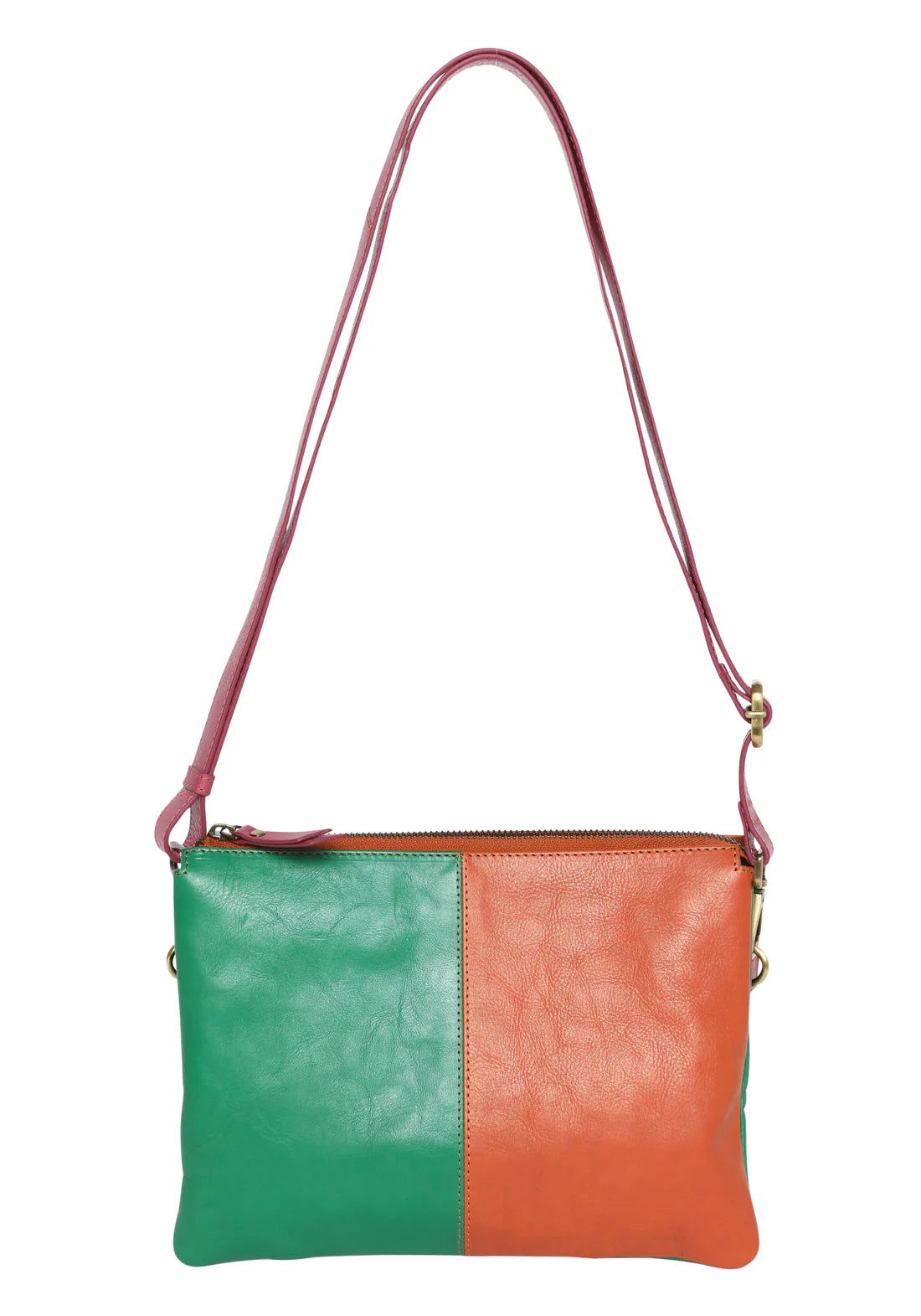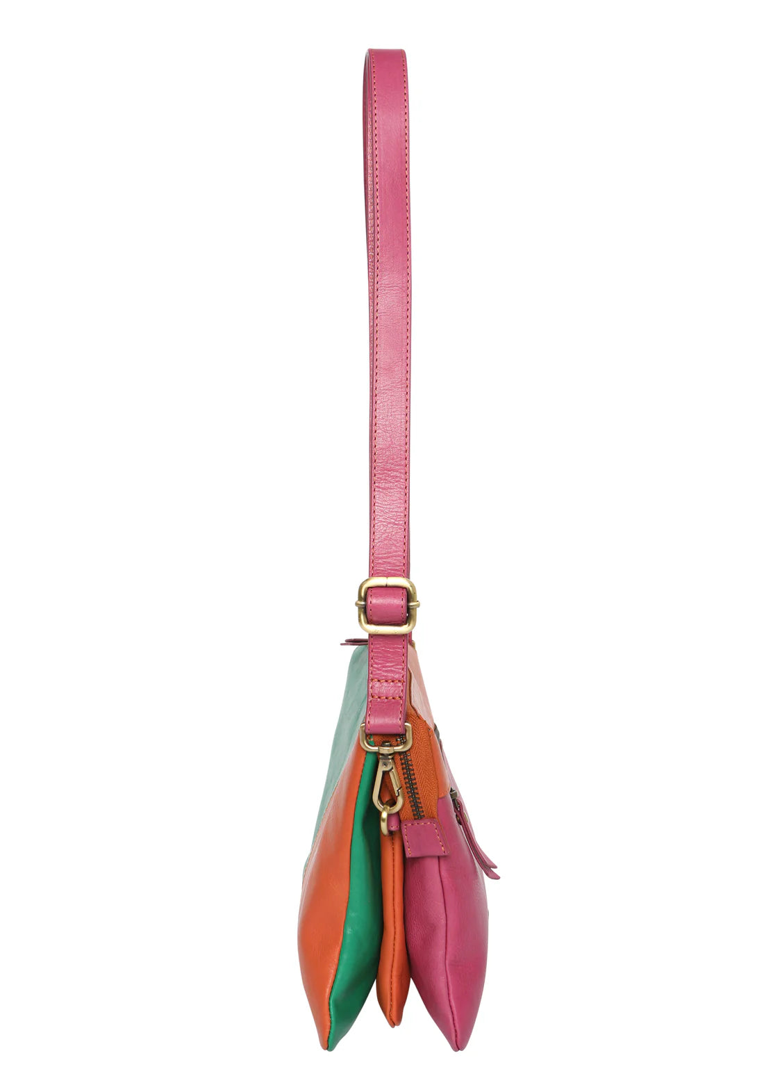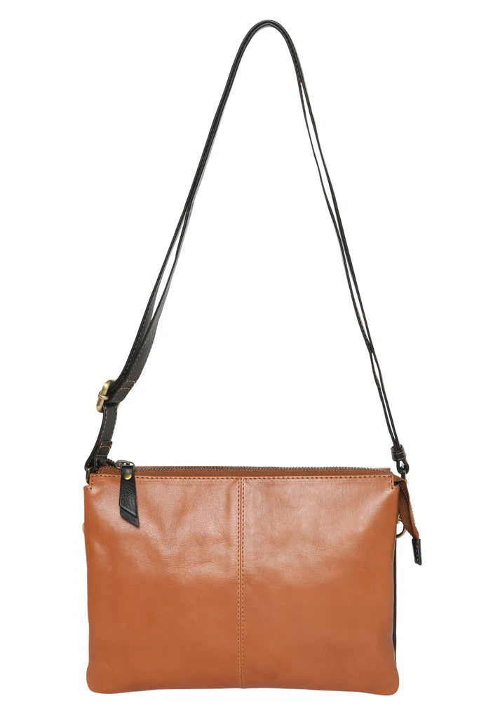 Center top zip, middle zip section, two outside sections, back outside zip, credit card slots.