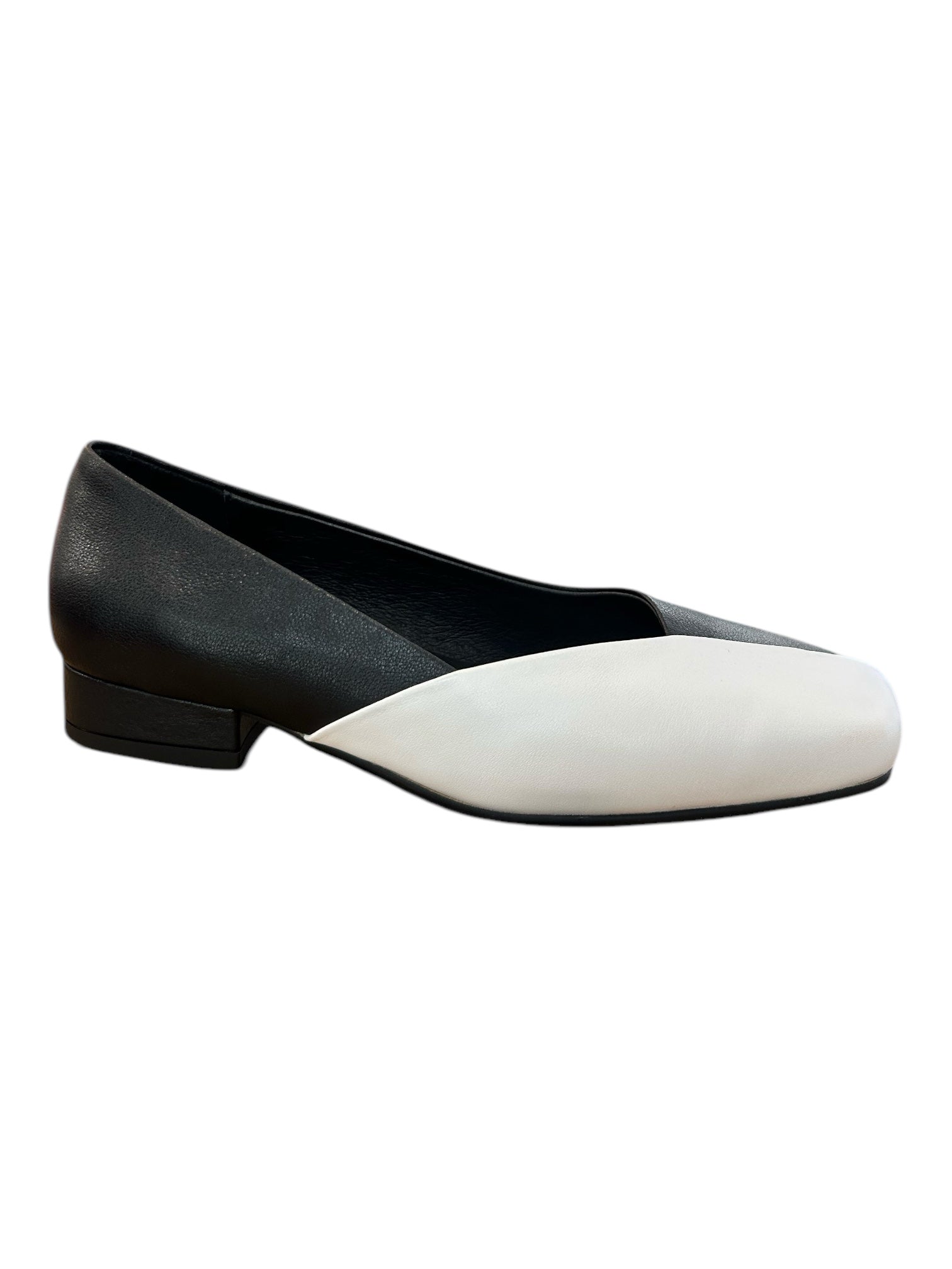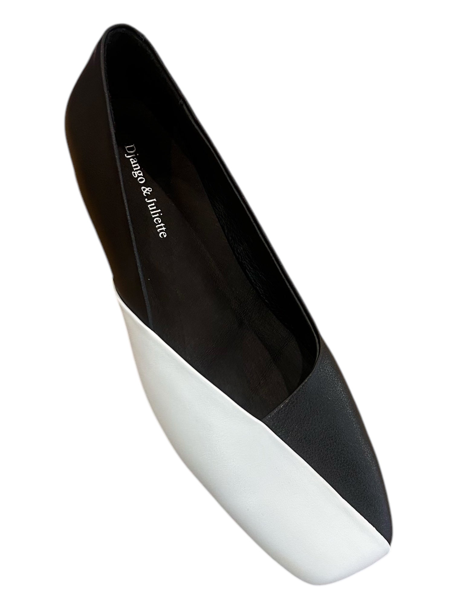 Django & Juliette is known for their bold, fashionable footwear, and these two-toned black and white slip-ons are a striking design choice!