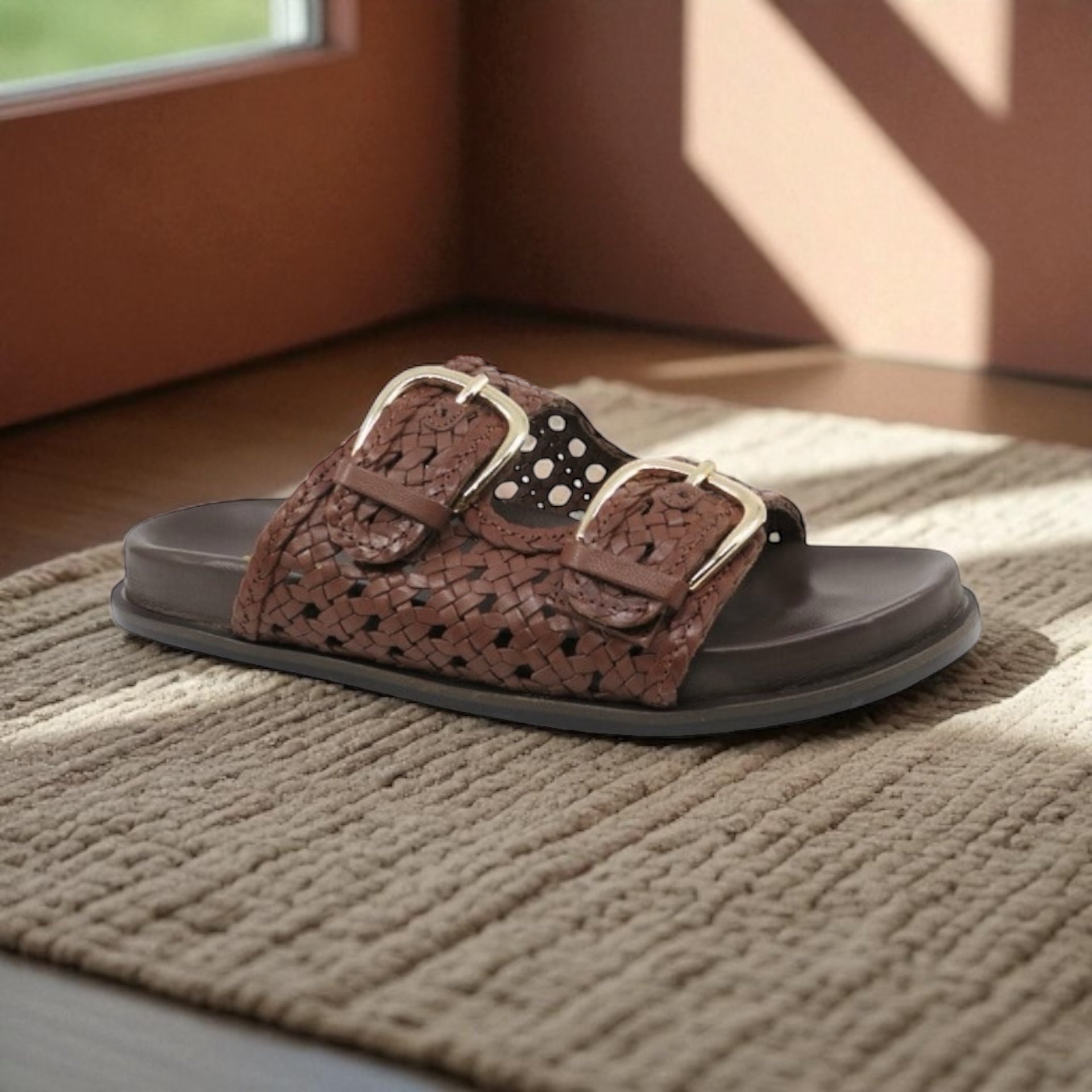 Say hello to BRITMI by Mollini – slides that do easy style so well. Woven leather in a rich choc colourway, bold gold buckles for a little shine, and the most amazing footbed that feels like a dream underfoot. Slip them on with wide-leg jeans, a floaty dress, or whatever’s clean – they just work.