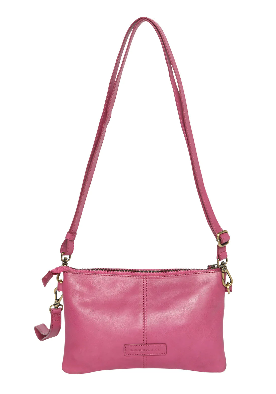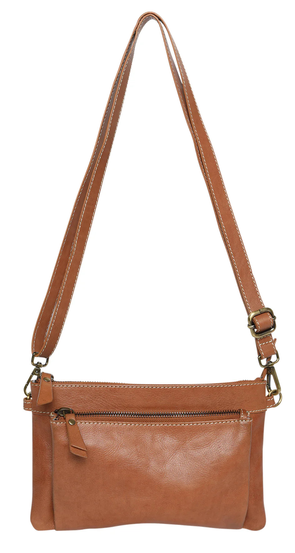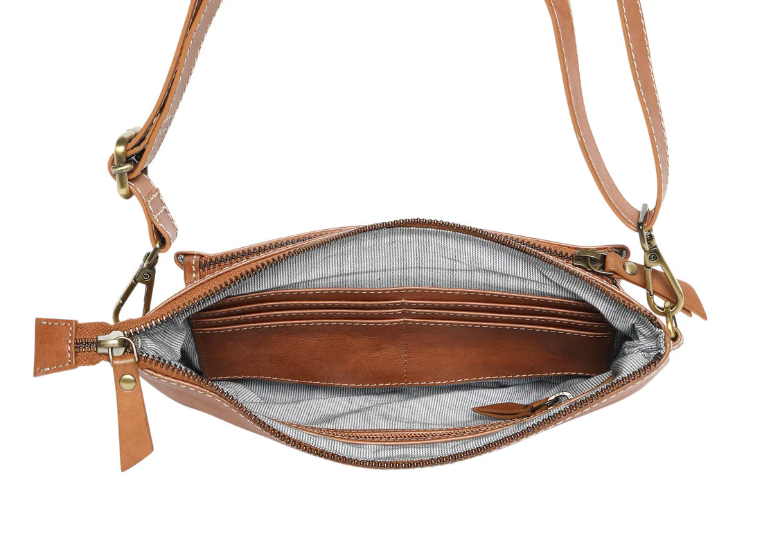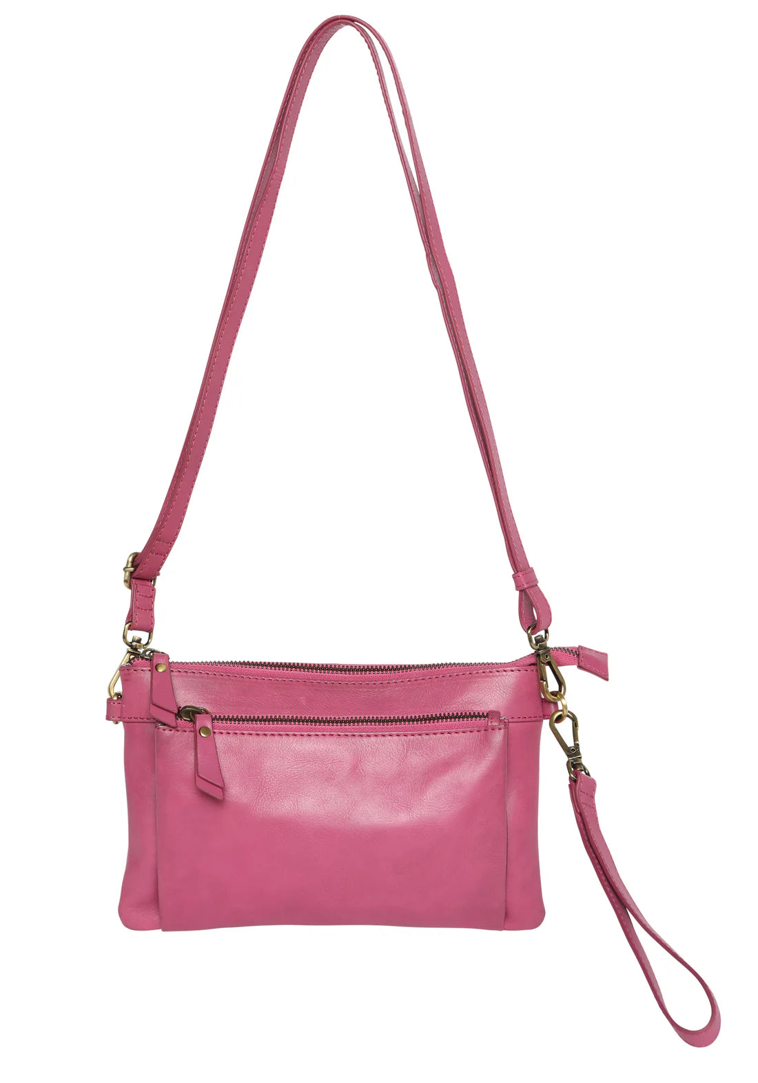 Zip top, card sections, back outside zip, cross body strap and wrist let, front key pocket.