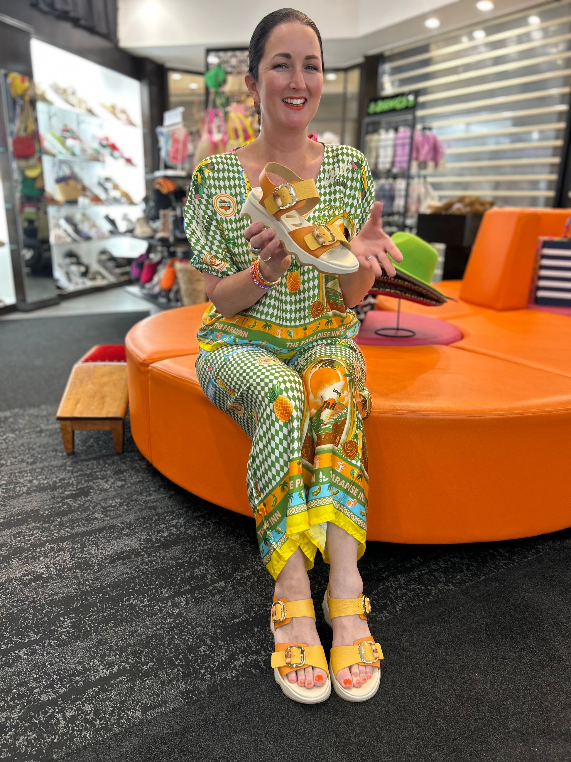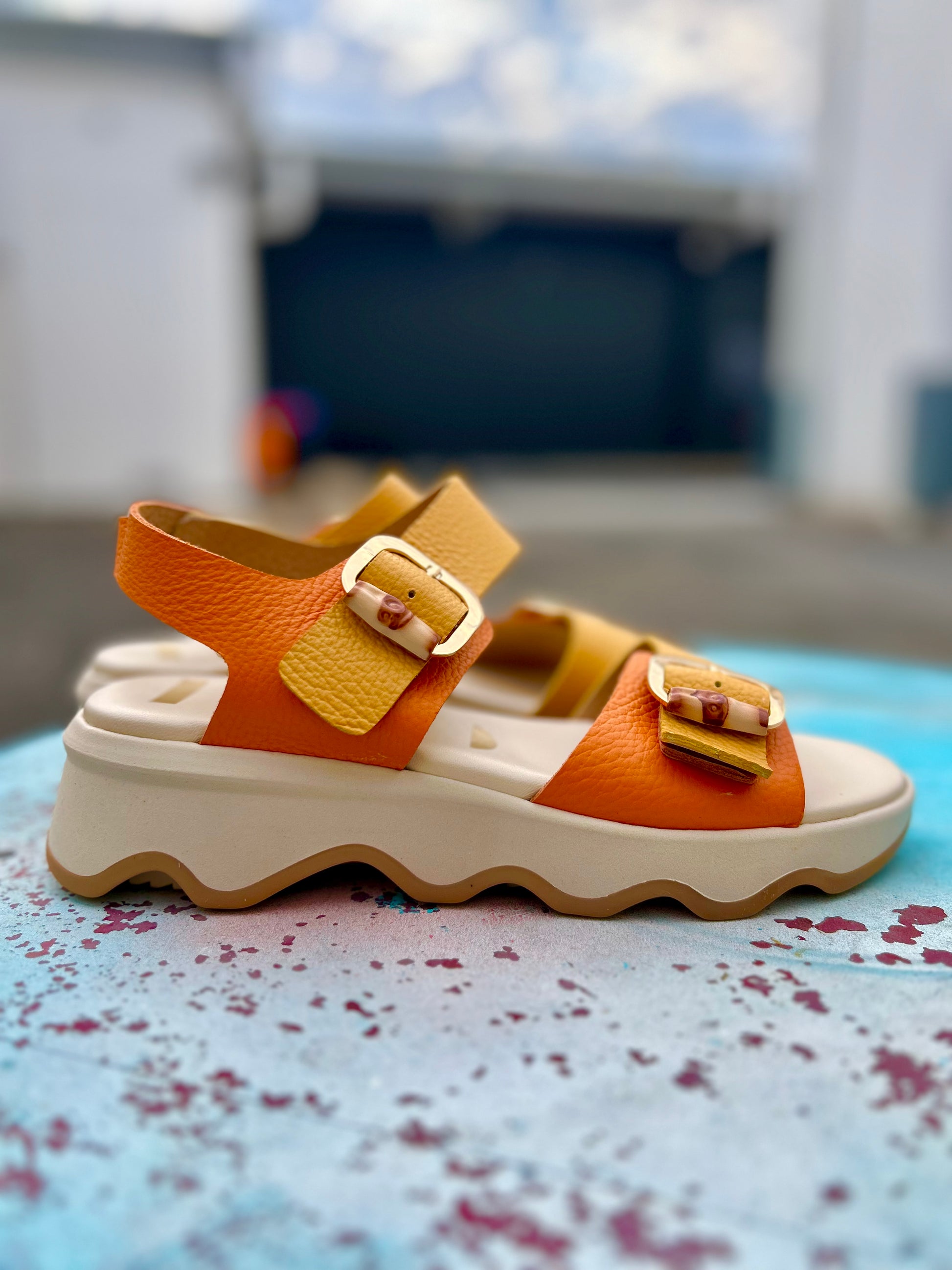 Neo Spain’s Wave sandal is making a splash. With its funky wave-shaped platform sole, two adjustable gold buckles, and that gorgeous grainy leather, it’s a head-turner. The orange–mustard combo is bold, playful, and far from ordinary — and yes, the insole is super soft too.