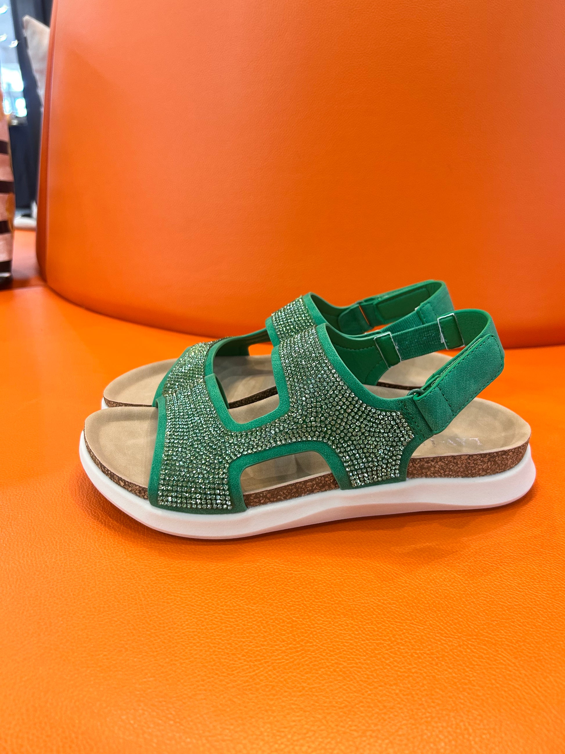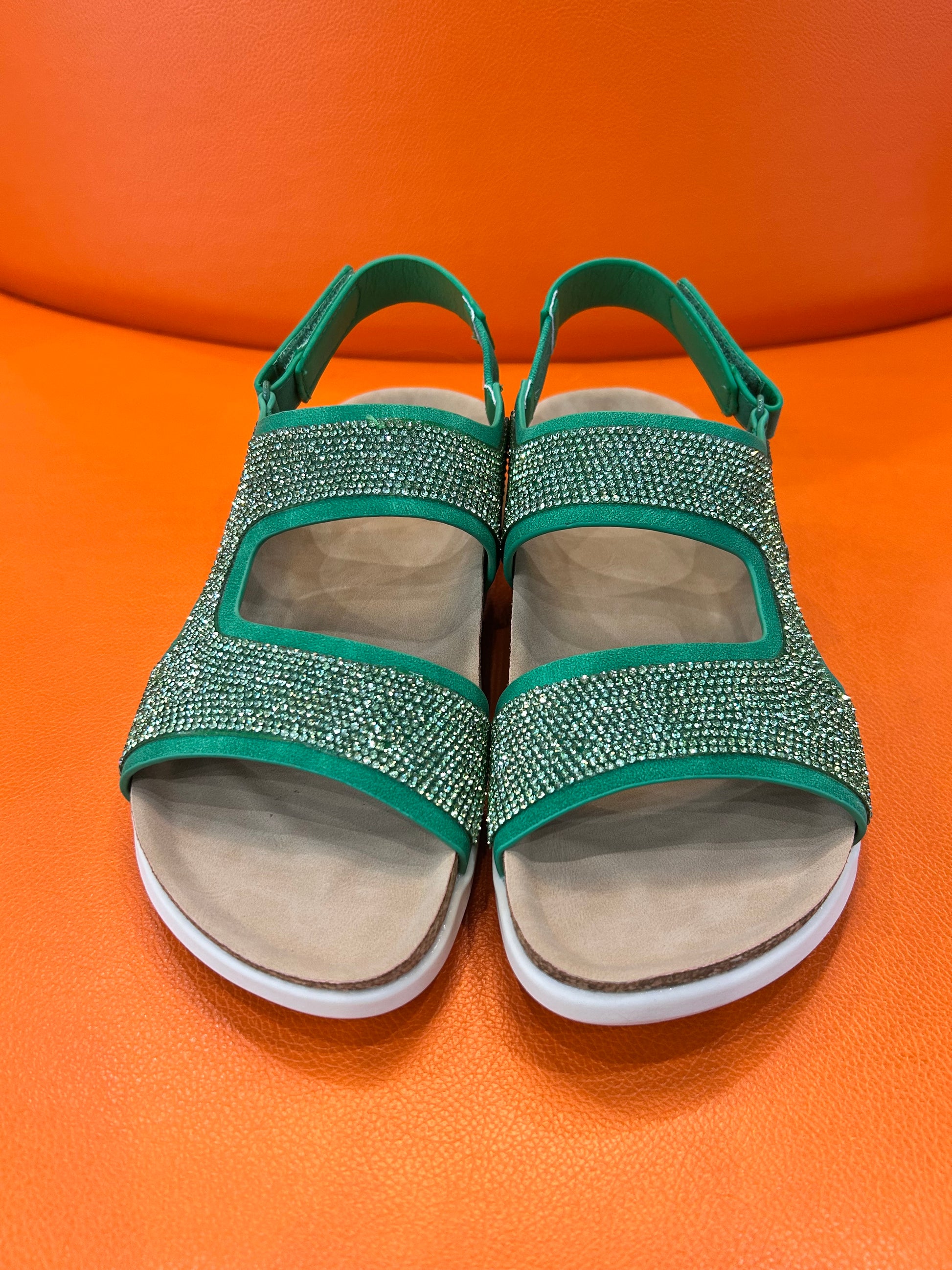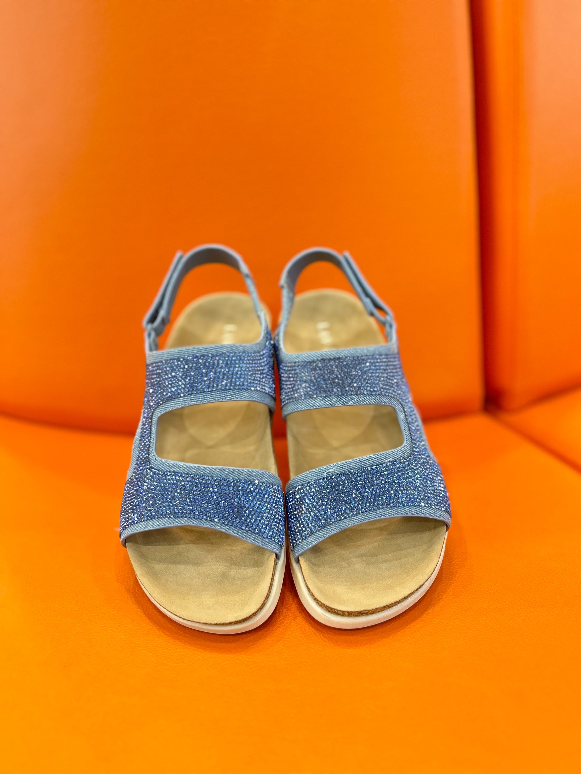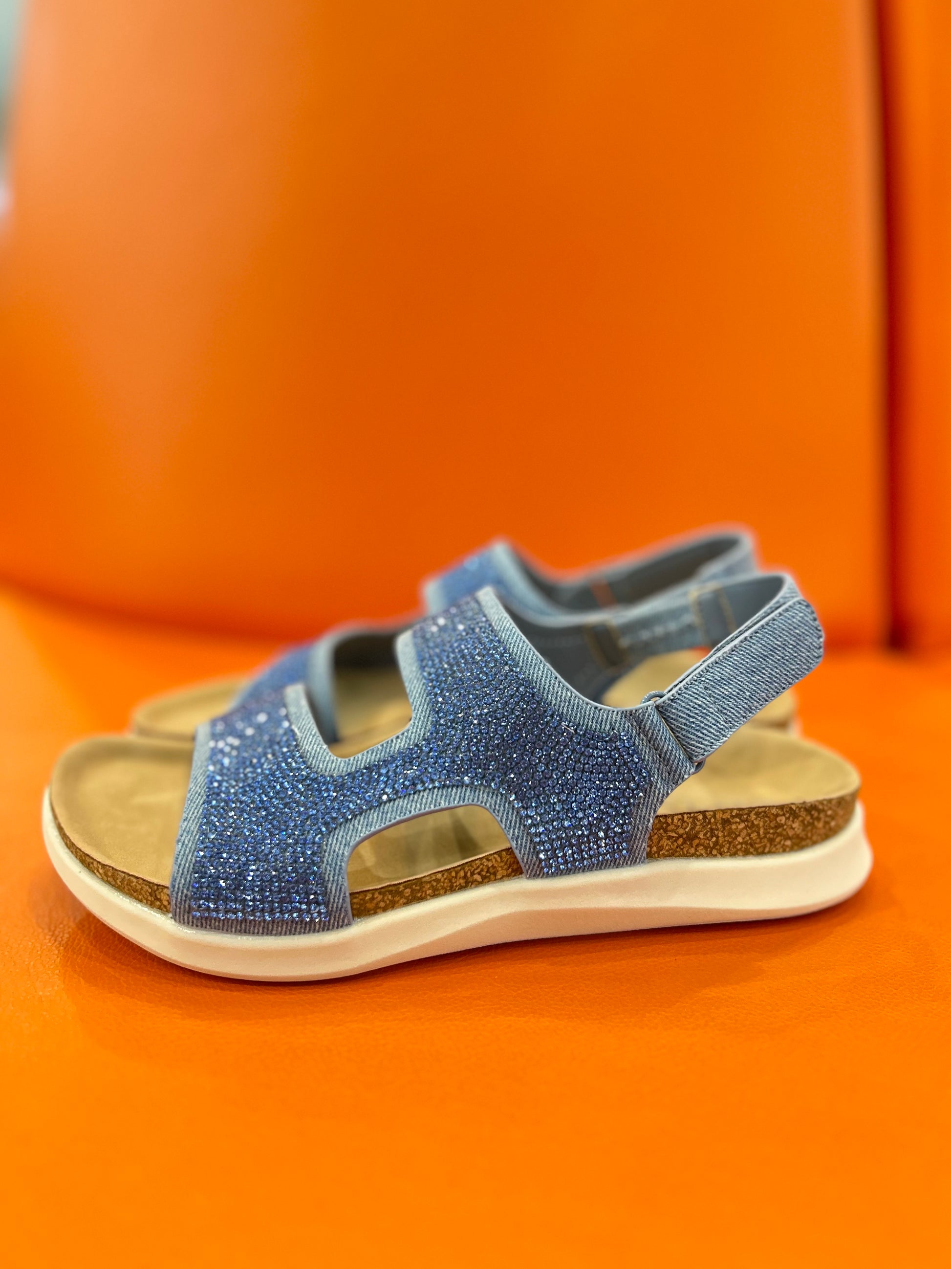 Step into pure joy with these Denim Bling sandals! Thanks to the comfort footbed designed with arch and metatarsal support, they are perfect for all day wear without sacrificing style. And let’s talk about that bling—sparkling accents that catch the light with every step, making these sandals not just a footwear choice, but a statement. Whether you’re strolling the boardwalk or shopping with friends, your feet will be pampered and your style will shine.