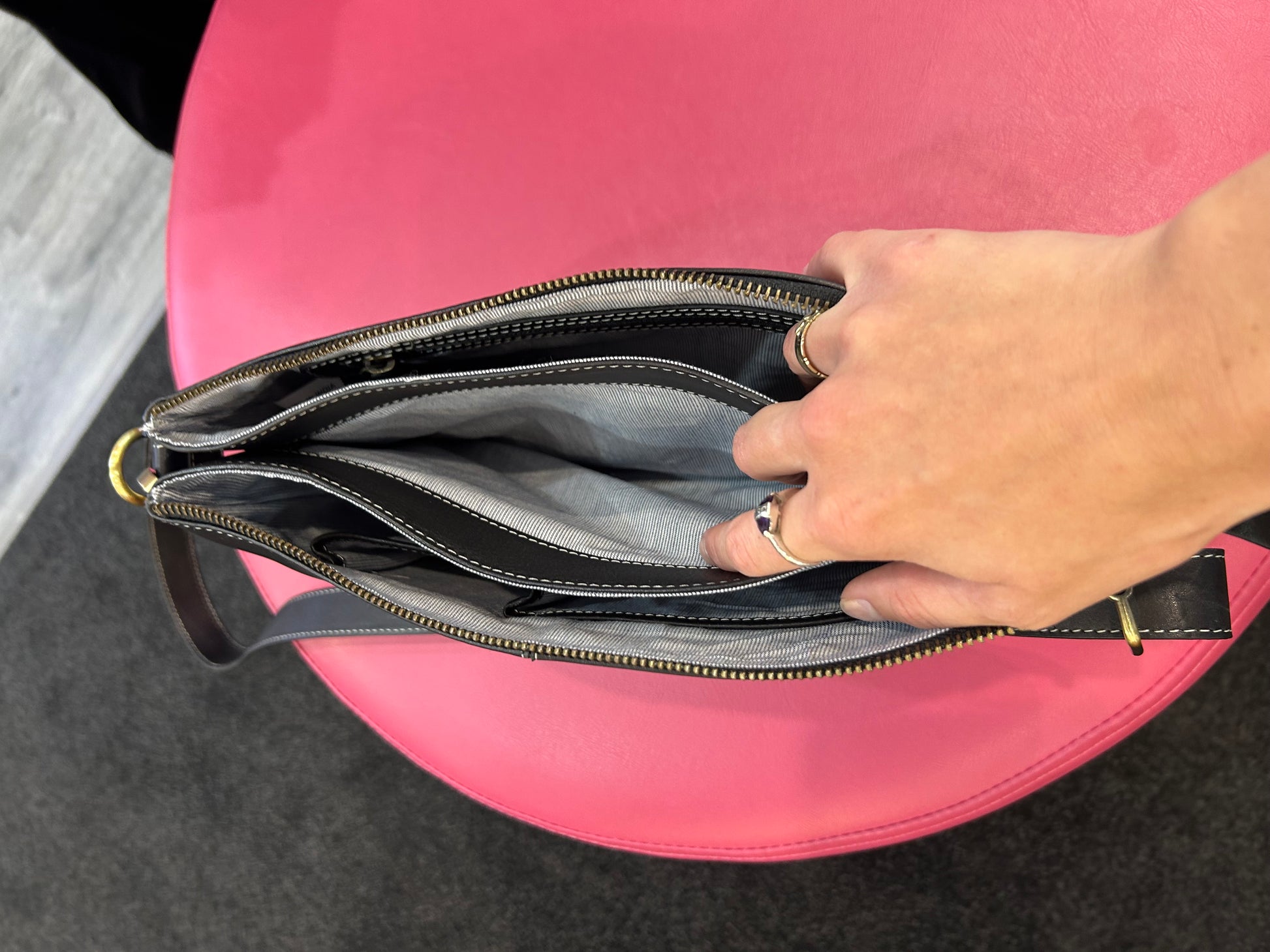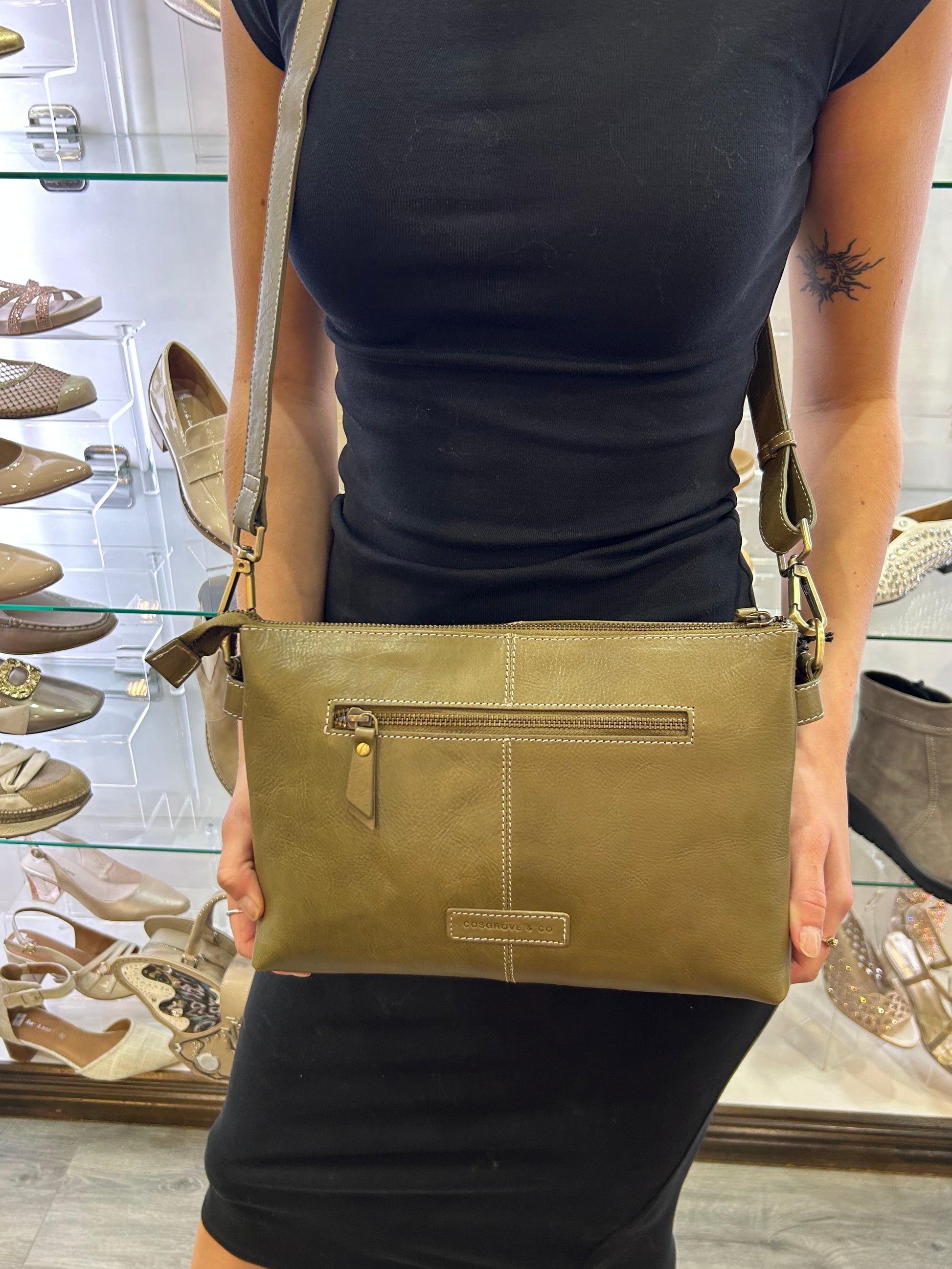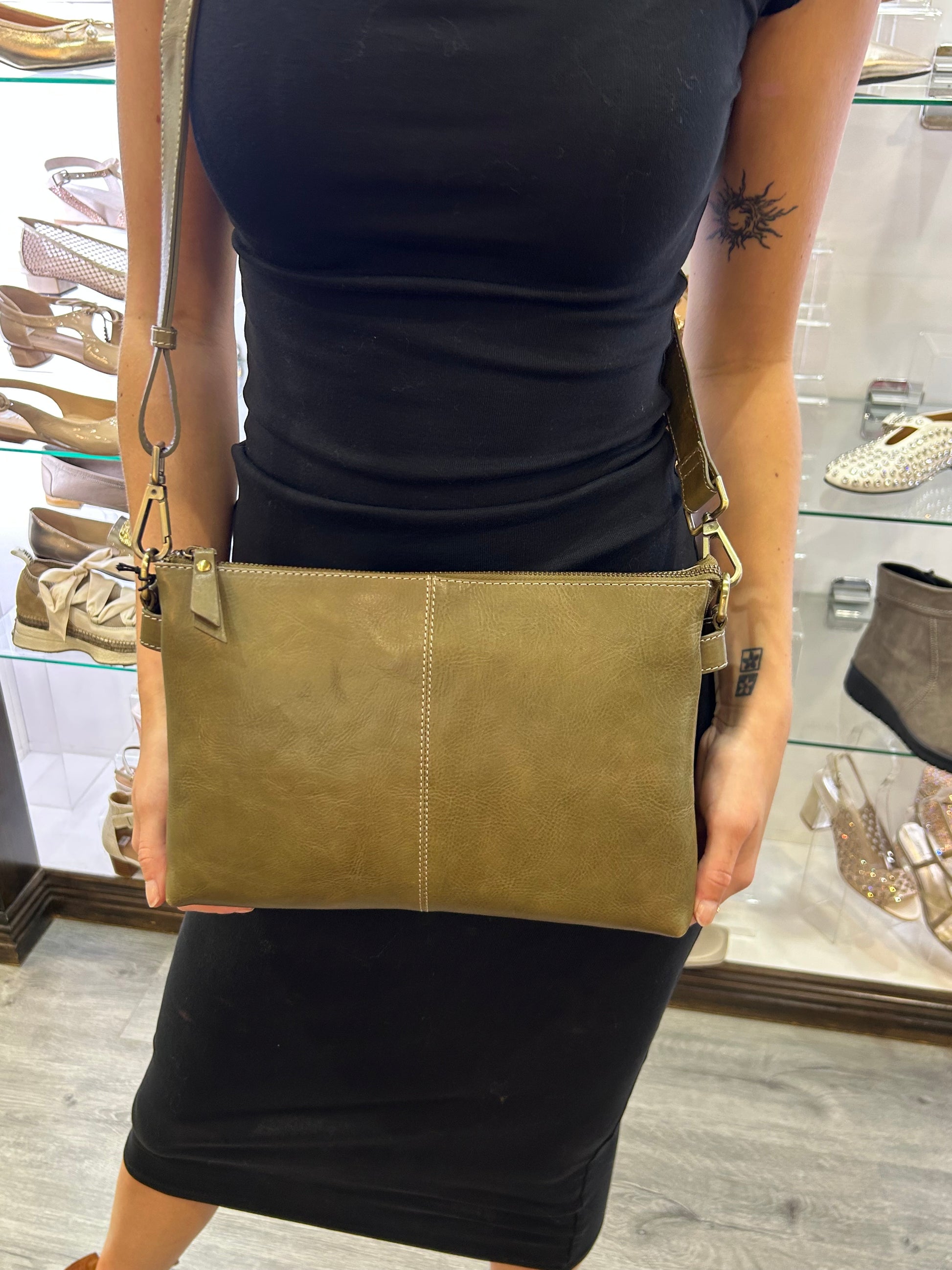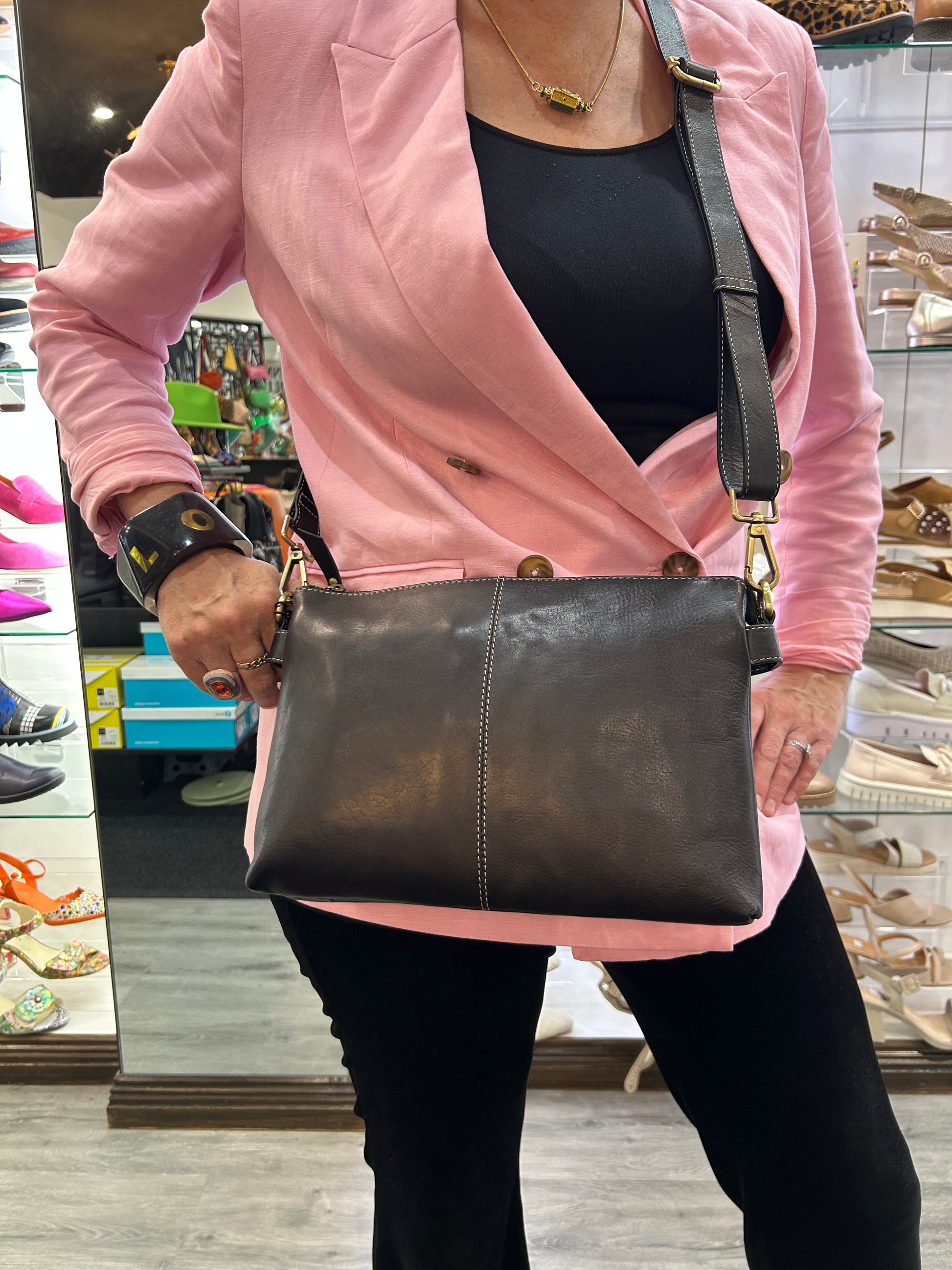 Subtle oatmeal stitching adds a refined touch to this beautifully structured East-West crossbody shoulder bag. Designed with both form and function in mind, it features a secure top zip closure and three thoughtfully arranged interior compartments to keep your essentials organized with ease.
