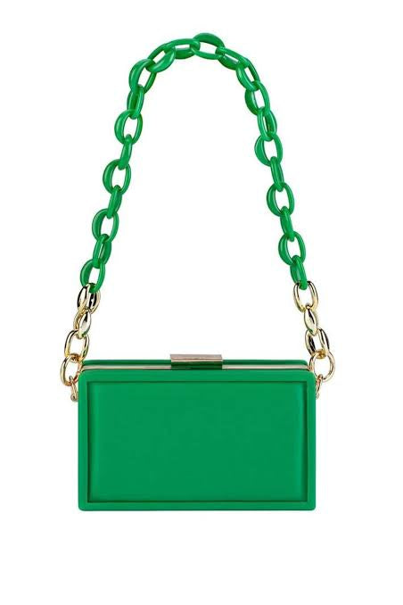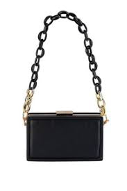 The Olga Berg Charlotte Box Bag features a boxy silhouette with a vegan leather finish and a stylish light gold chain strap. It has ample space for a large smartphone and includes a removable, longer gold-tone shoulder chain for versatility. It boasts gold-tone hardware, a branded block lock closure, and comes with a protective dust bag. Perfect for day-to-night events.