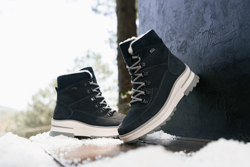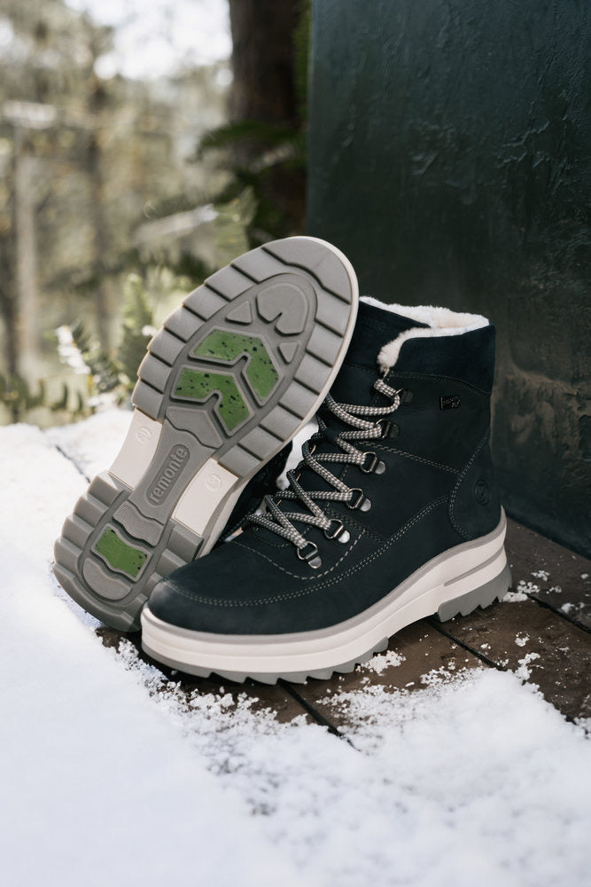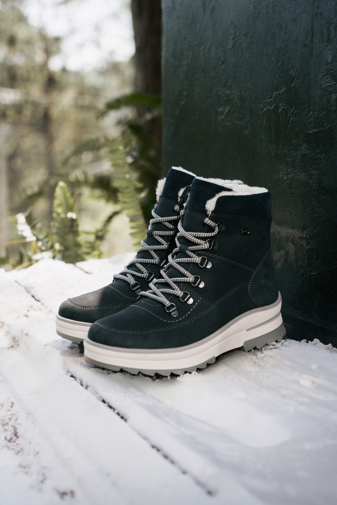 Happy feet, happy life! These remonte lace-up boots in steel blue made of suede leather warm your feet with ultra cozy inner material. The lacing is complemented by the zipper and thus guarantees optimal support and ideal fit. The striking eyelets provide the perfect finish and a striking look. The shoe has a cushioning and grippy sole that impresses with good traction for a secure step. The water-resistant upper protects against wetness, the thermal insole keeps the inside of the shoe warm and the Glass-Fibre technology provides extra grip. Cozy and very warm virgin wool ensures warm feet at low temperatures. That means: endless strolling is no problem at all!