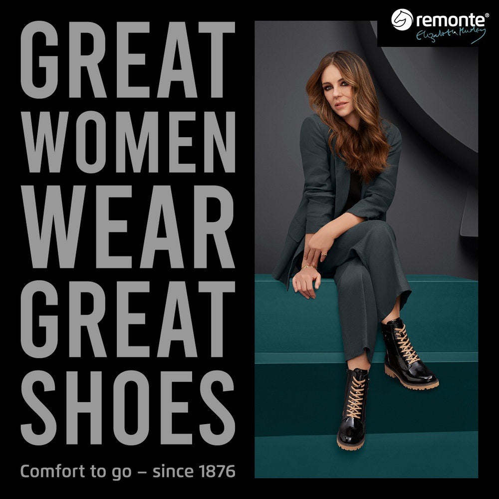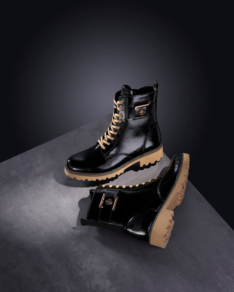 Style and comfort - the perfect duo! You'll be cool and casual, yet stylish, with these remonte lace-up boots made of patent leather. The clever combination of lacing and zipper gives optimal support and makes it easy to put on and take off the shoe. In addition, there are exchangeable laces. The bronze coloured decorative elements on the side adds that certain something. The functional highlights are perfectly rounded off by the padded and removable insole and the cushioning and especially light sole with block heel. The shoe is the perfect choice for big feet: it is cut in comfort width and available in oversizes. It doesn't get any more comfortable than this!