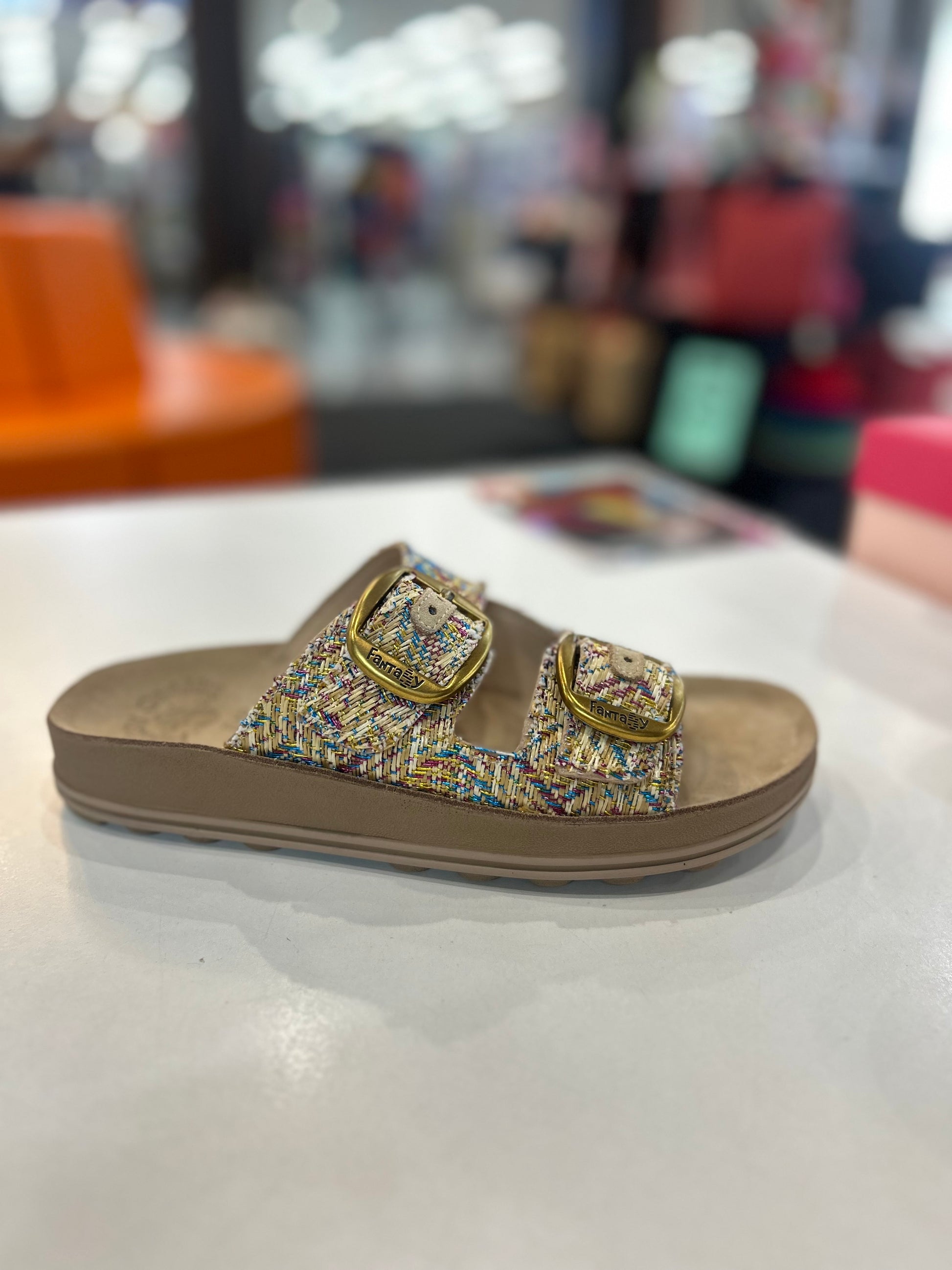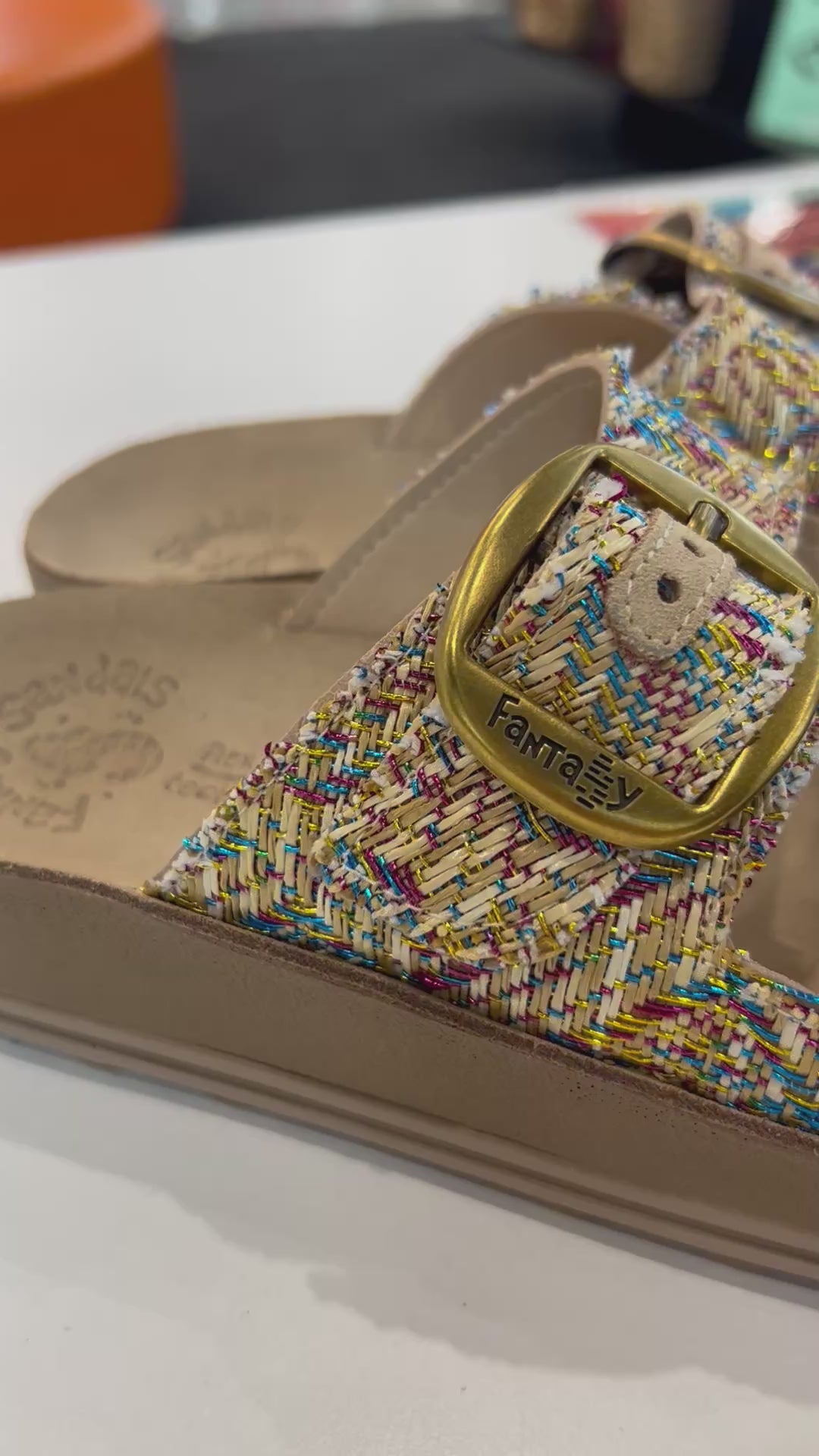 Step into style with our new double bar adjustable slide from Fantasy, Greece! Featuring a stunning multi-colour weave that captures the vibrant spirit of the Mediterranean, these slides are as eye-catching as they are comfortable. The supported footbed cradles your feet, making every step feel like a mini-vacation. Plus, the gorgeous oversized buckles add a playful touch that’s sure to turn heads. Perfect for beach strolls or brunch dates, these slides will keep your feet happy and your style on point!