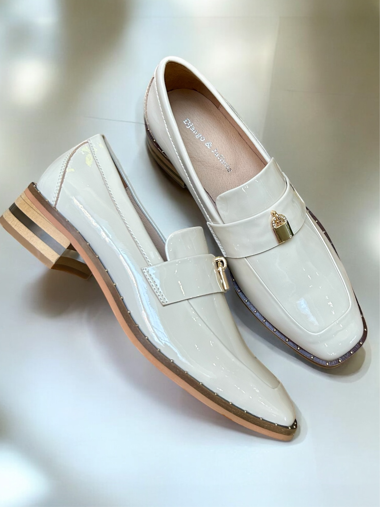 This shoe features smooth vanilla patent leather with a delicate stud detail and a locket trim for a little extra flair. The Perspex sliced stack heel adds a modern touch, giving it a fresh, stylish vibe. It’s a perfect mix of classic and contemporary.