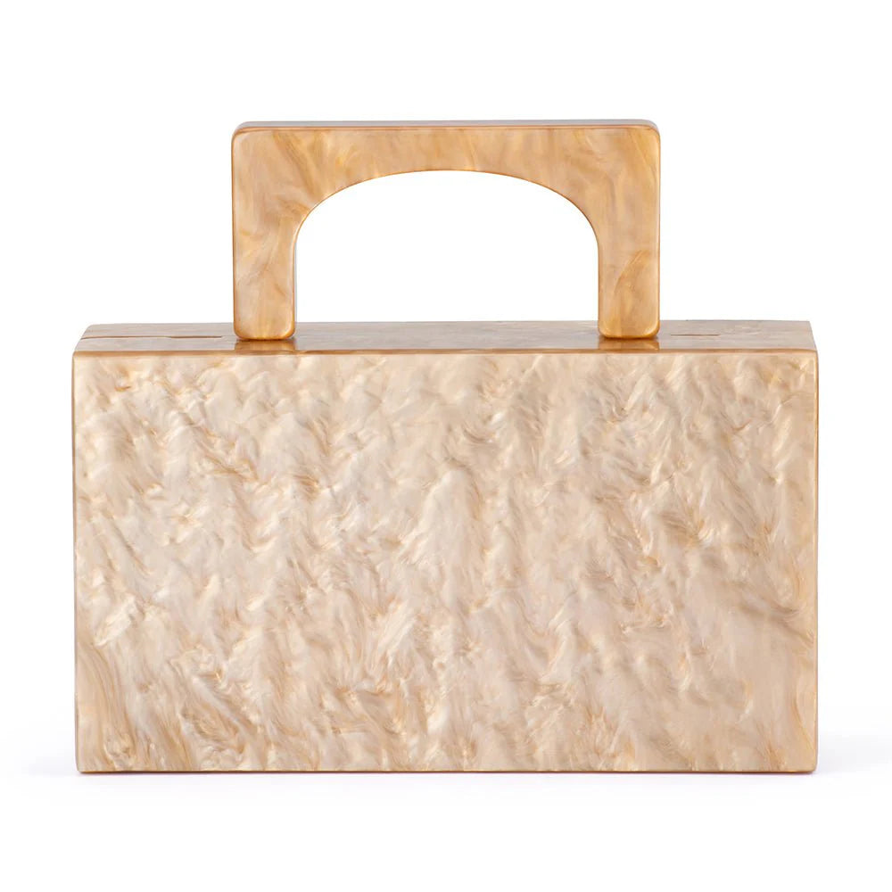 The adorable FLEUR Acrylic Top Handle bag features a jigsaw of tonal pattern acrylic pieces on the front face of this show stopping hard body clutch, which features a matching acrylic top handle for easy carrying, as well as plenty of space inside to store all your on-the-go necessities.