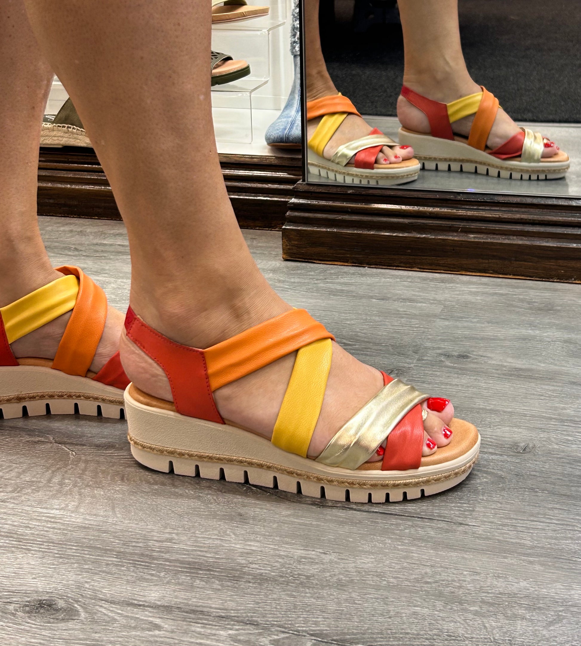 X marks the spot for style with the X-Bonita cross-over wedge sandals! Crafted in sunny Spain, these beauties feature divine rolled gold, mustard, papaya, and red leather that are going to wrap your feet in pure luxury. An elastic gusset has been added on the heel for a flexible fit and a cleated sole for all-day adventure, this summer you’ll be stepping into a treasure trove of comfort and flair. So slip them on and get ready to strut your stuff—because these wedges are the ultimate map to fabulous!