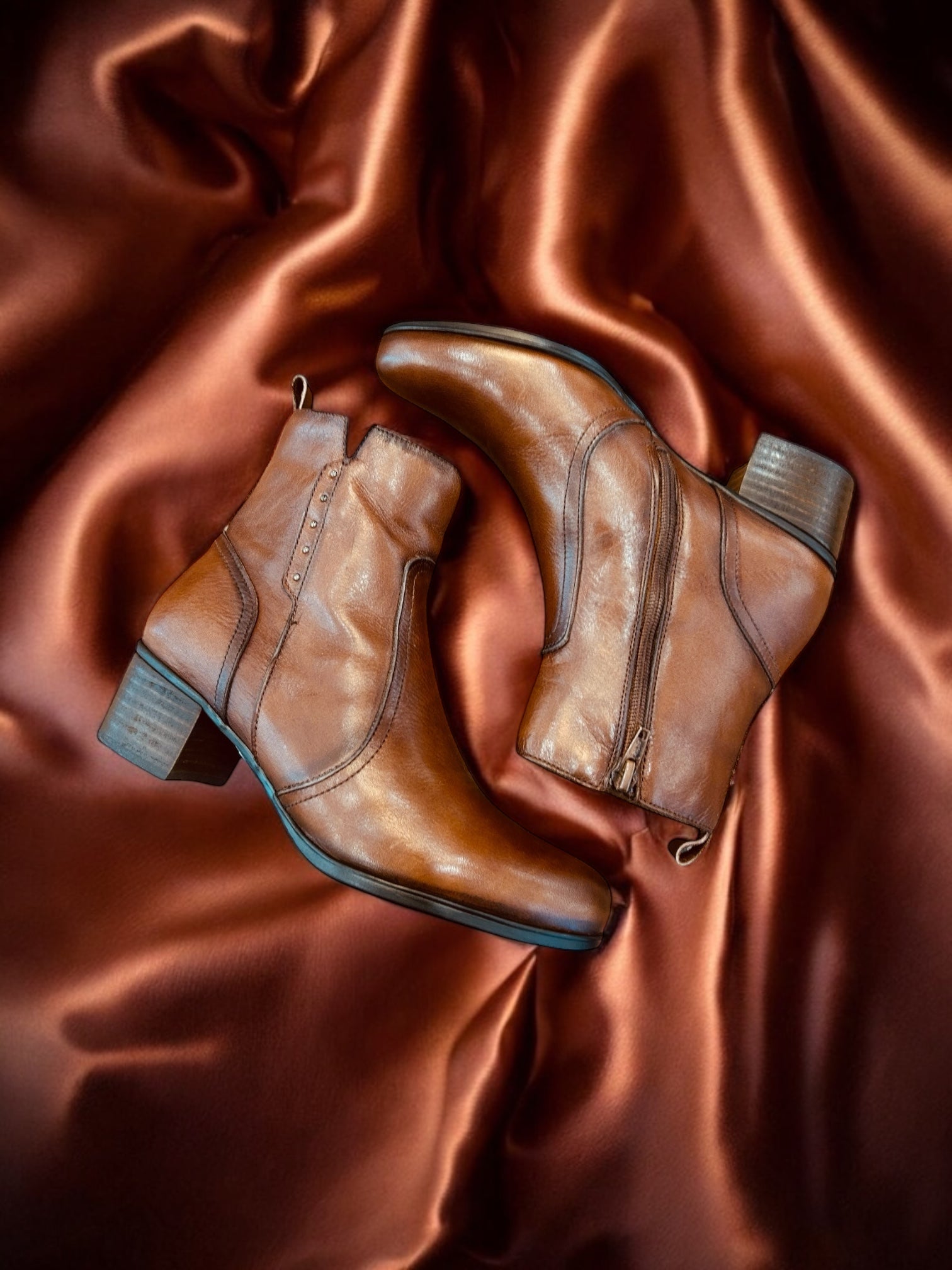 This distinguished boot from Zeta is a testament to impeccable craftsmanship and refined style. The rich tan leather, adorned with subtle chocolate burnishing, lends a depth and warmth to its silhouette, enhancing its refined aesthetic. The stitch detailing gracefully accentuates the boot’s contours. What a stunner!