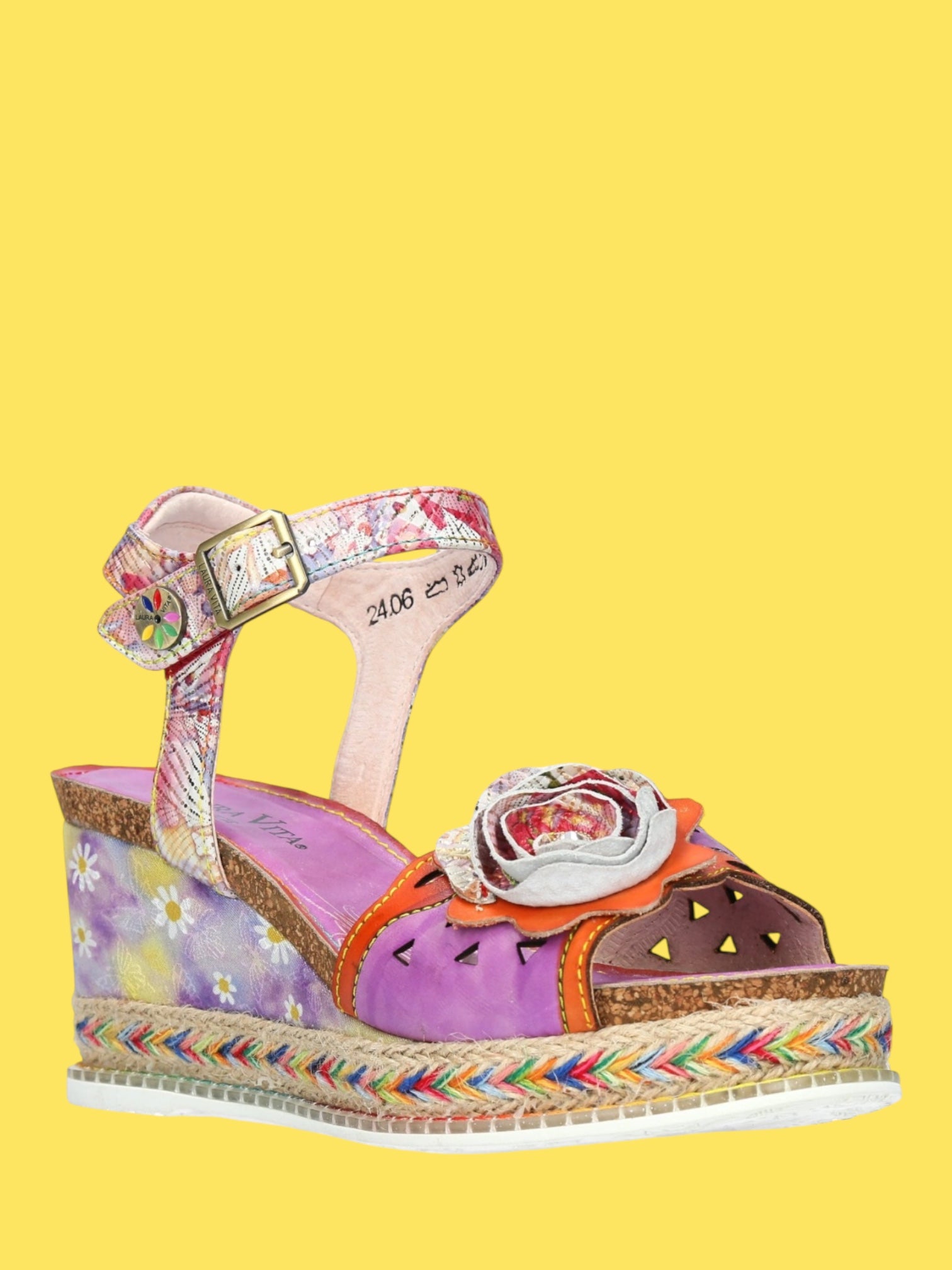 Step into standout style with this gorgeous wedge from Laura Vita France. With its eye-catching design and perfect balance of height and comfort, this is a wedge made to turn heads. The stunning colour palette of violet and red with daisy and floral details makes it a true showpiece, while thoughtful design touches add both charm and wearability.