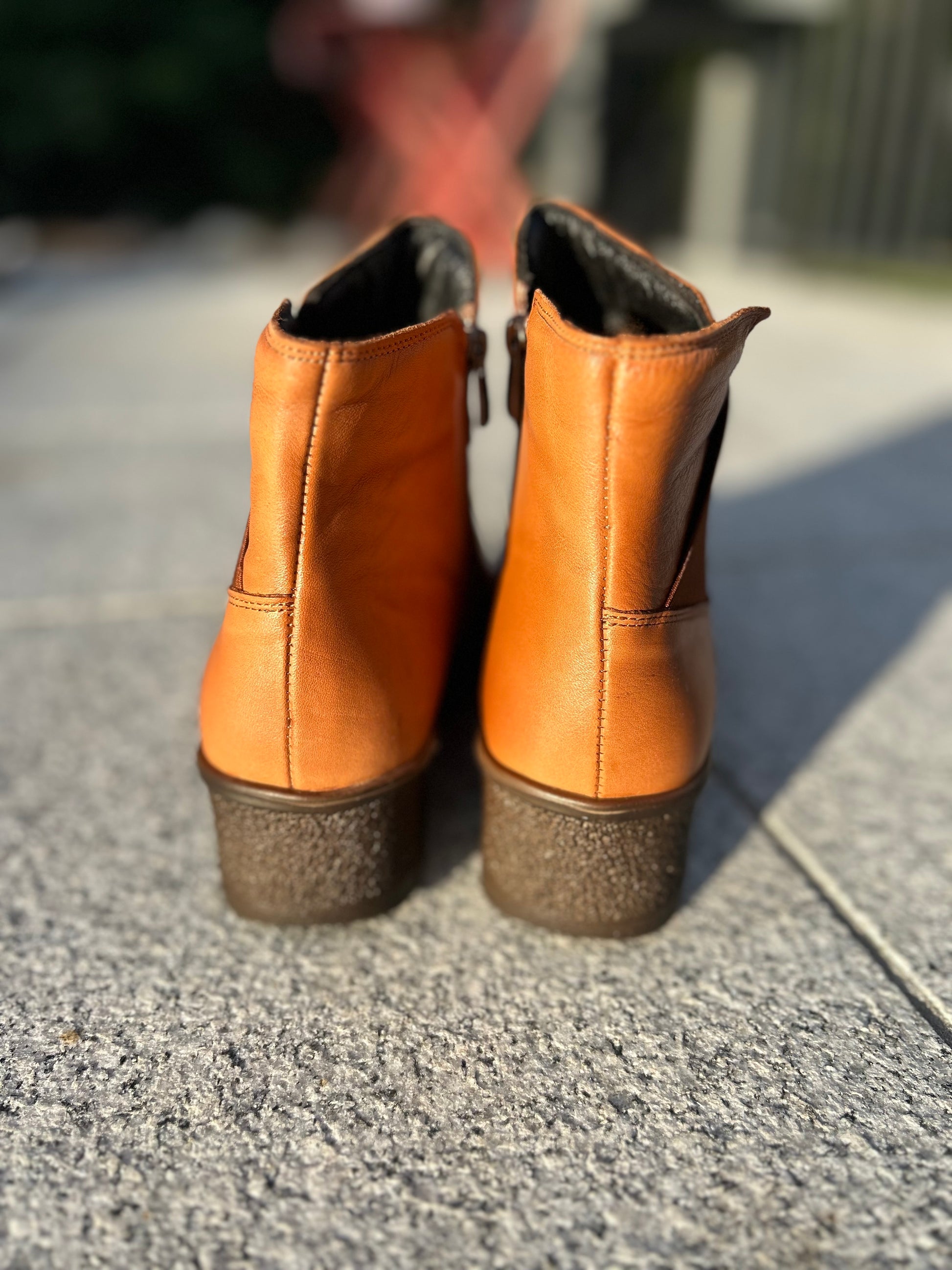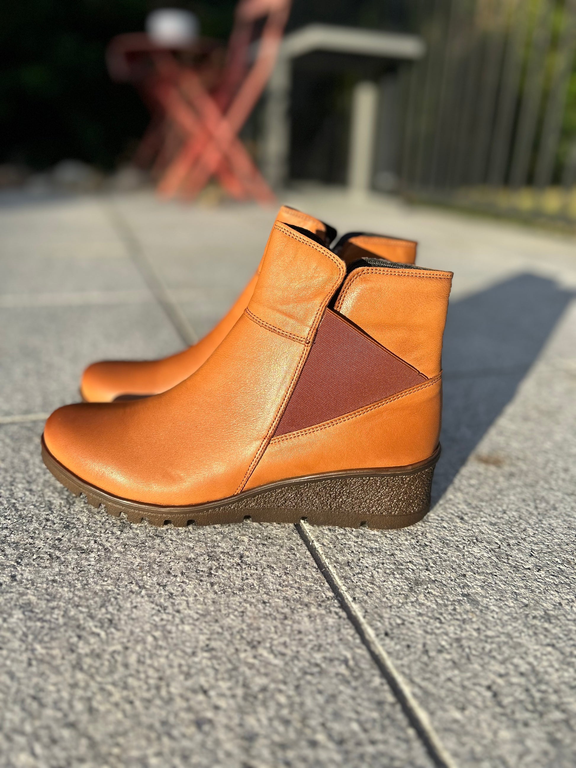 Holly by Thyme and Co. is a stylish ankle boot in a timeless tan hue, featuring an internal zip and elastic gussets for effortless slip-on comfort. The wedge sole not only enhances the boot's chic design but also absorbs impact, providing exceptional support for your feet, legs, and back. Made in Turkey, this boot combines fashion with function for all-day comfort and style.