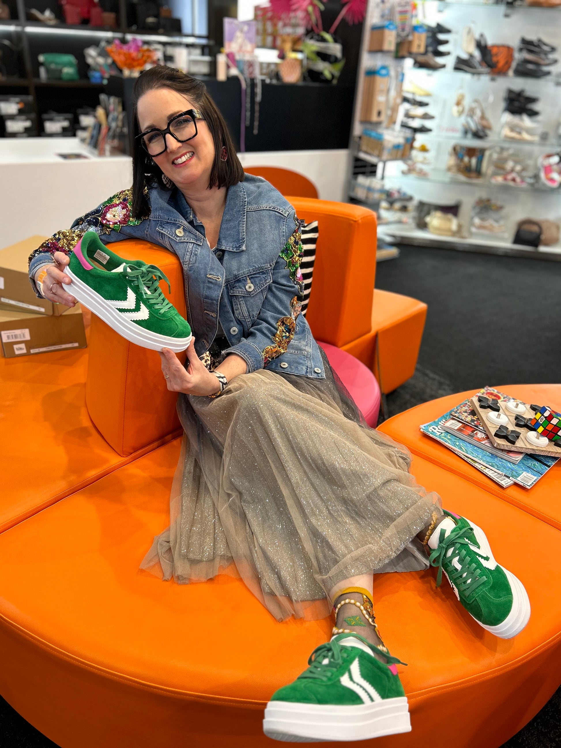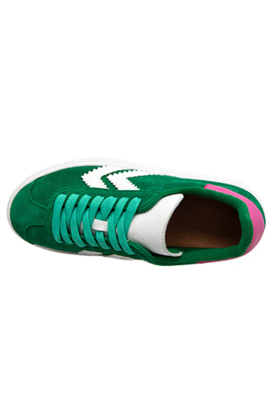 Constructed with a trending platform rubber sole this retro sneaker combines a lush forest suede leathered upper, white arrow trims, a pink heel tab and ultra padded removable memory foam sock.