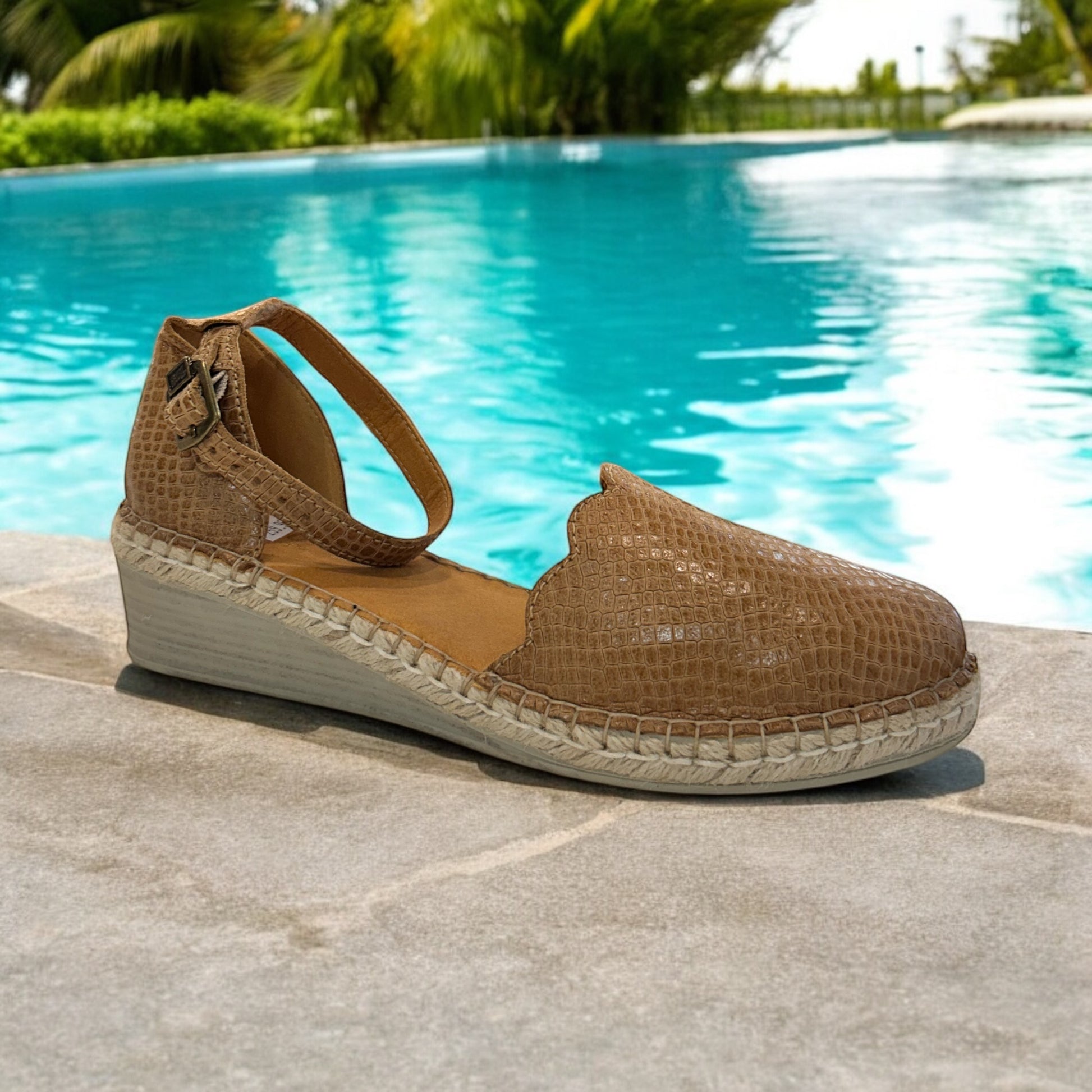 Tsonga’s Inkantolo wedge features a closed in toe design and an adjustable ankle strap for a comfortable and secure fit. With its earthy tones and rustic details it is the perfect shoe for any summer occasion.