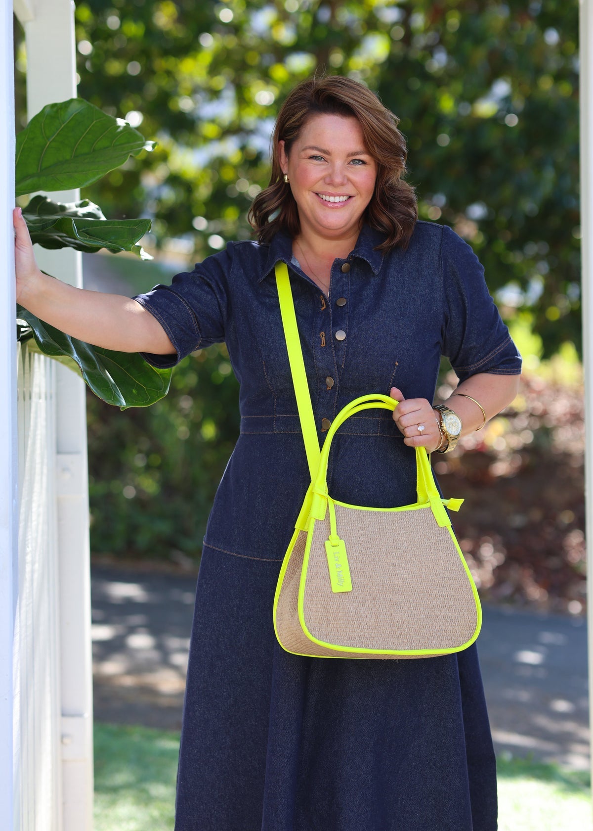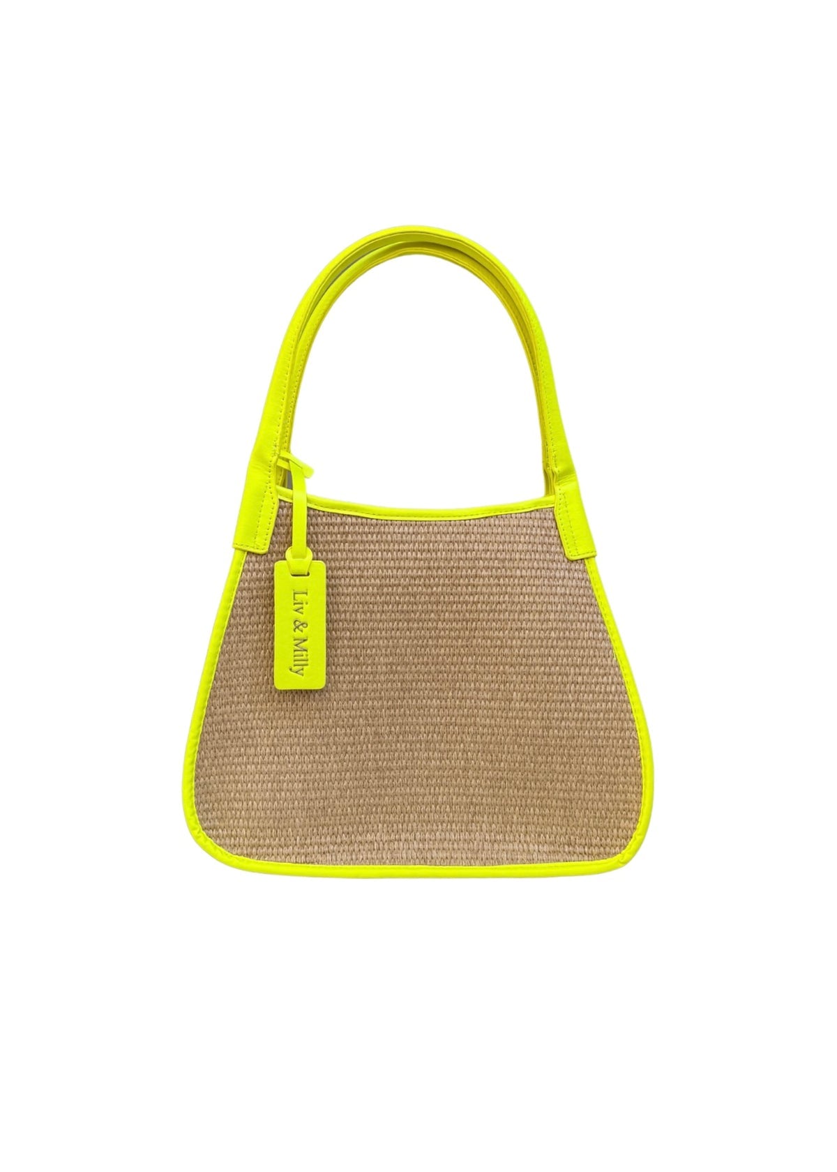 Make a bold statement with this woven top-handle bag, accented with eye-catching neon trim. Fully lined for a polished finish, it features an internal pocket and a zip pocket to keep your essentials in place. Carry it by the structured handle or switch to the removable, adjustable crossbody strap for hands-free ease. A playful blend of texture, function, and standout style.