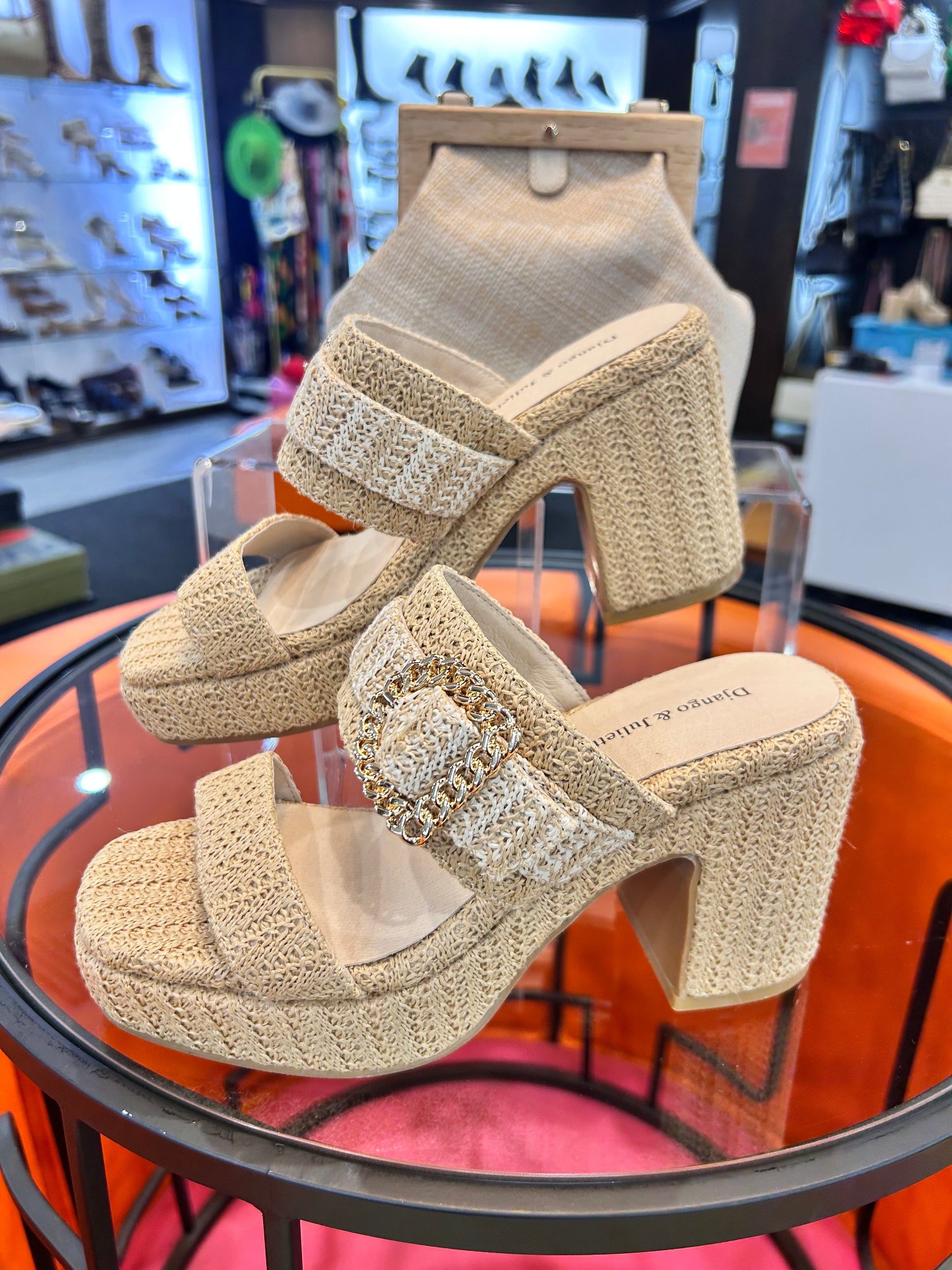 Klaire from Django & Juliette is the platform slide with instant allure. In natural raffia with a striking gold buckle, Klaire brings texture, height and just the right amount of glamour.