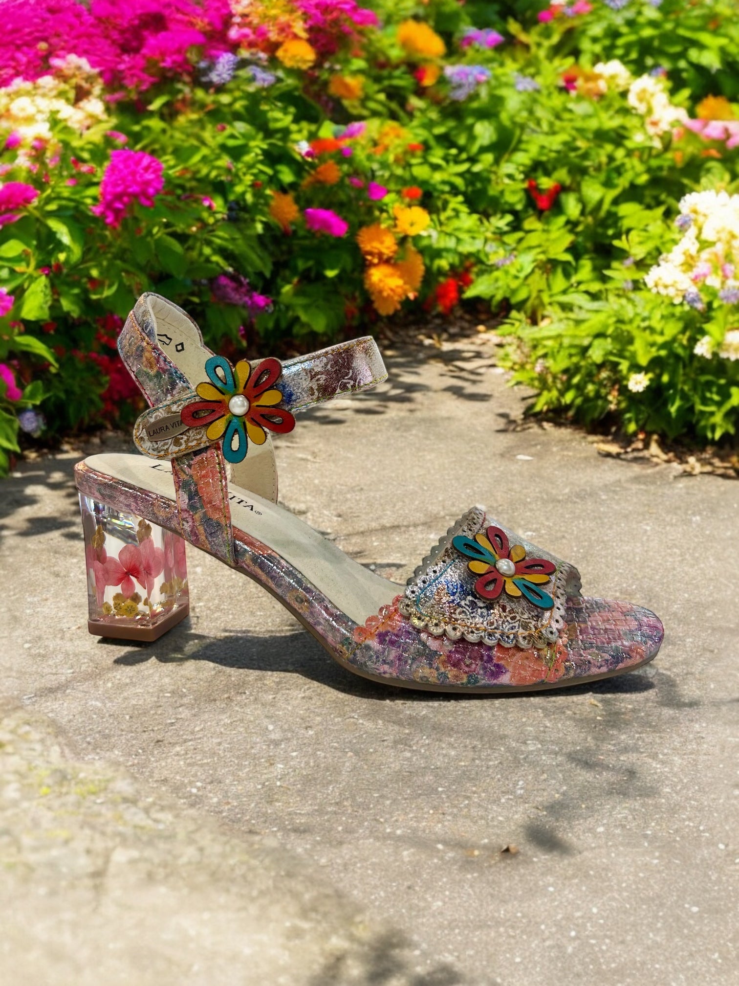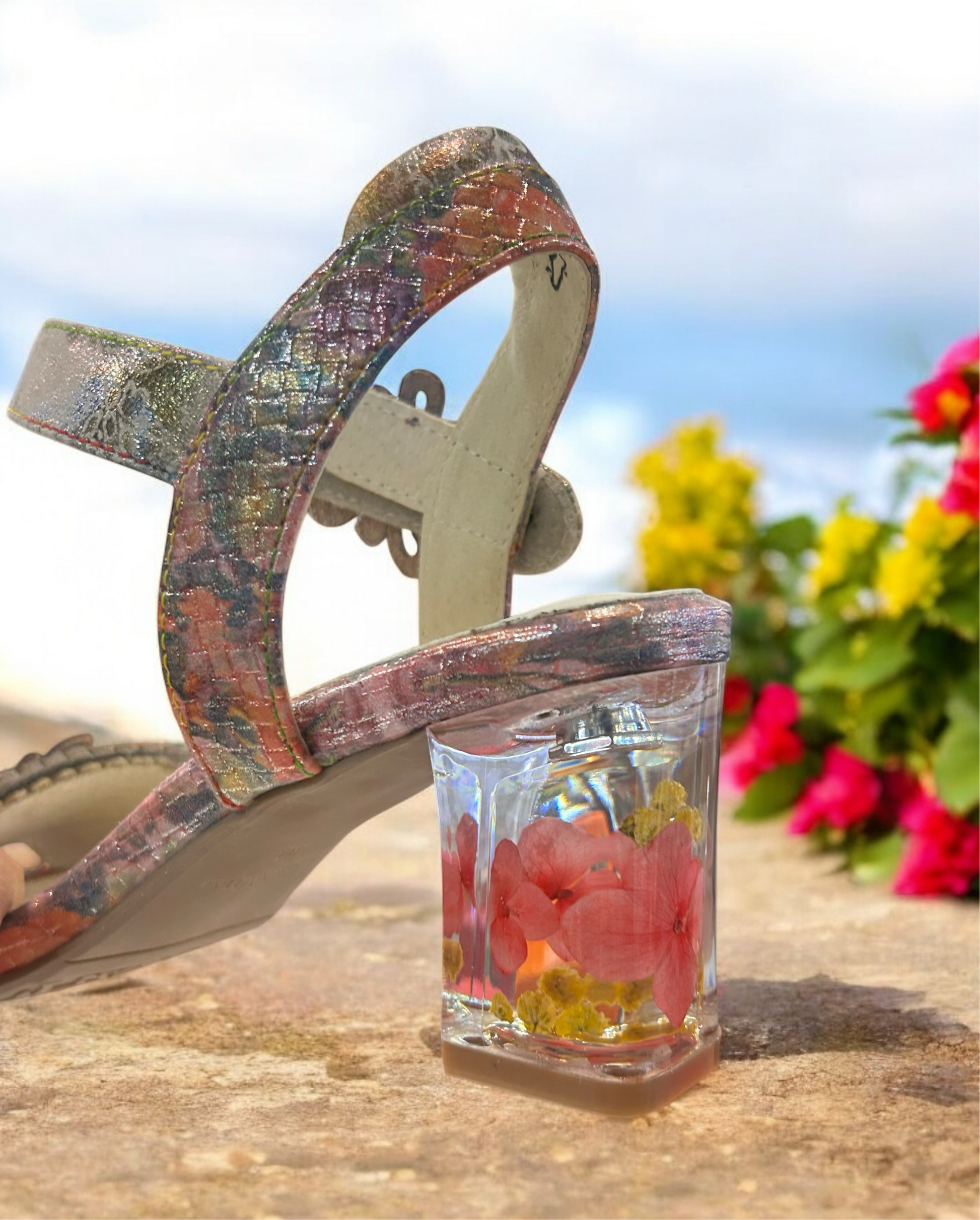Prepare to be enchanted by the Lucieo 13 heels — a true masterpiece! With double adjustable Velcro straps, these beauties offer the perfect, customizable fit. But it's not just about comfort; have you ever seen such elegance captured in a heel before? The exquisite floral design is a showstopper, and the multi-metallic leather adds a dazzling touch, making these heels not only stunning but wonderfully versatile. A perfect fusion of whimsy and sophistication!