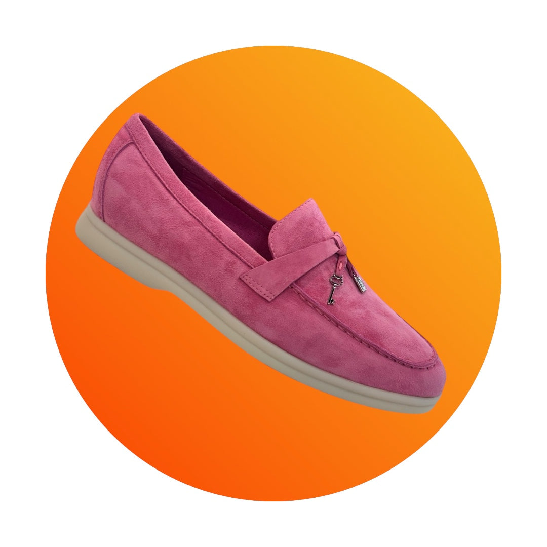 These stunning pink and blue soft suede slip-ons feature a charming locket trim, adding a touch of elegance to a casual style. With a luxurious leather lining and a durable, non-slip sole, they offer both comfort and practicality for everyday wear.