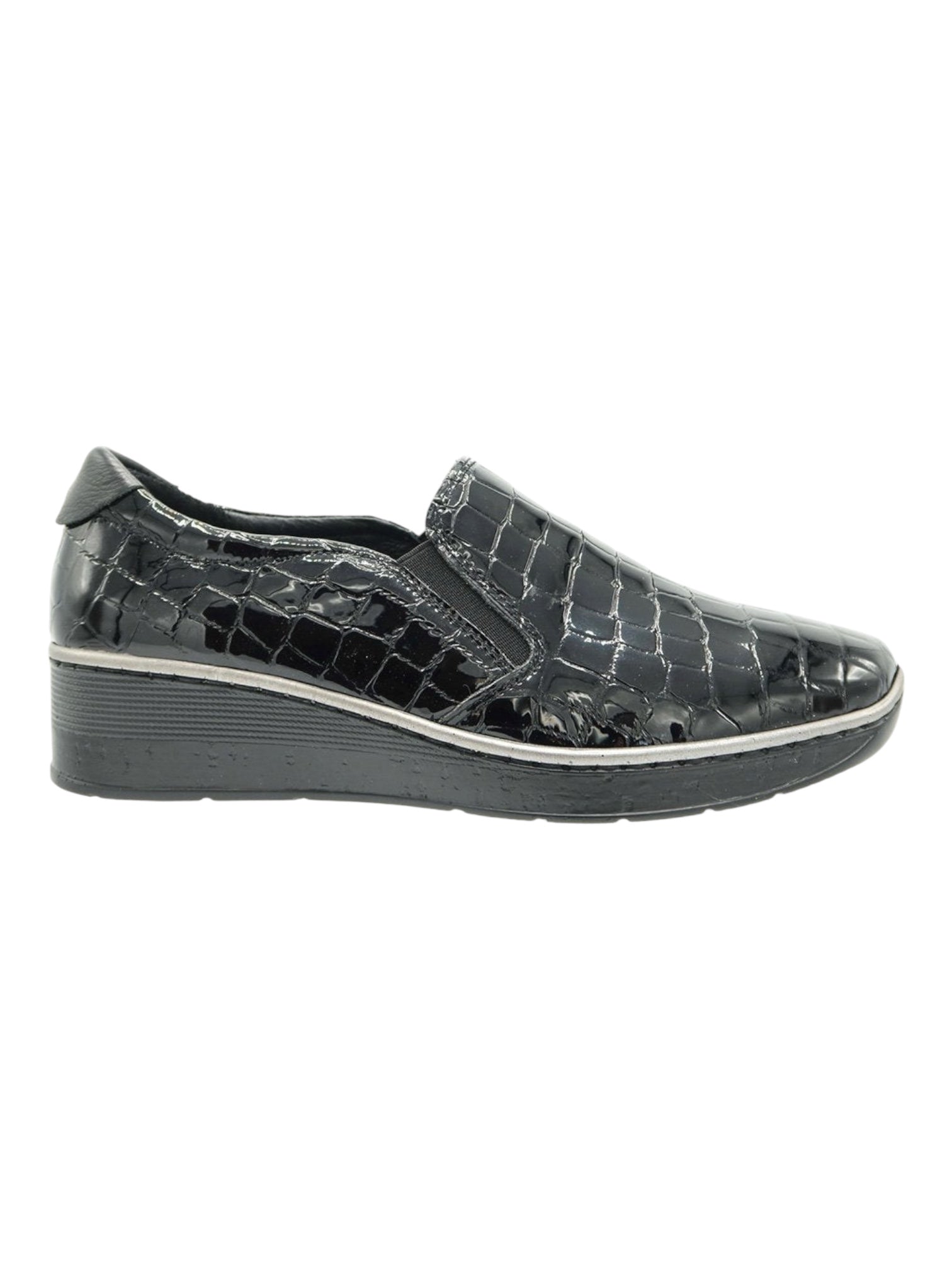 Step into style with this fabulous everyday shoe! Featuring a sleek croc print patent leather upper, it’s as trendy as it is comfortable. Twin elastic gussets ensure a perfect fit, while the low wedge rubber sole keeps you strutting with ease all day long. A stylish mix of fashion and function—your go-to for any occasion!