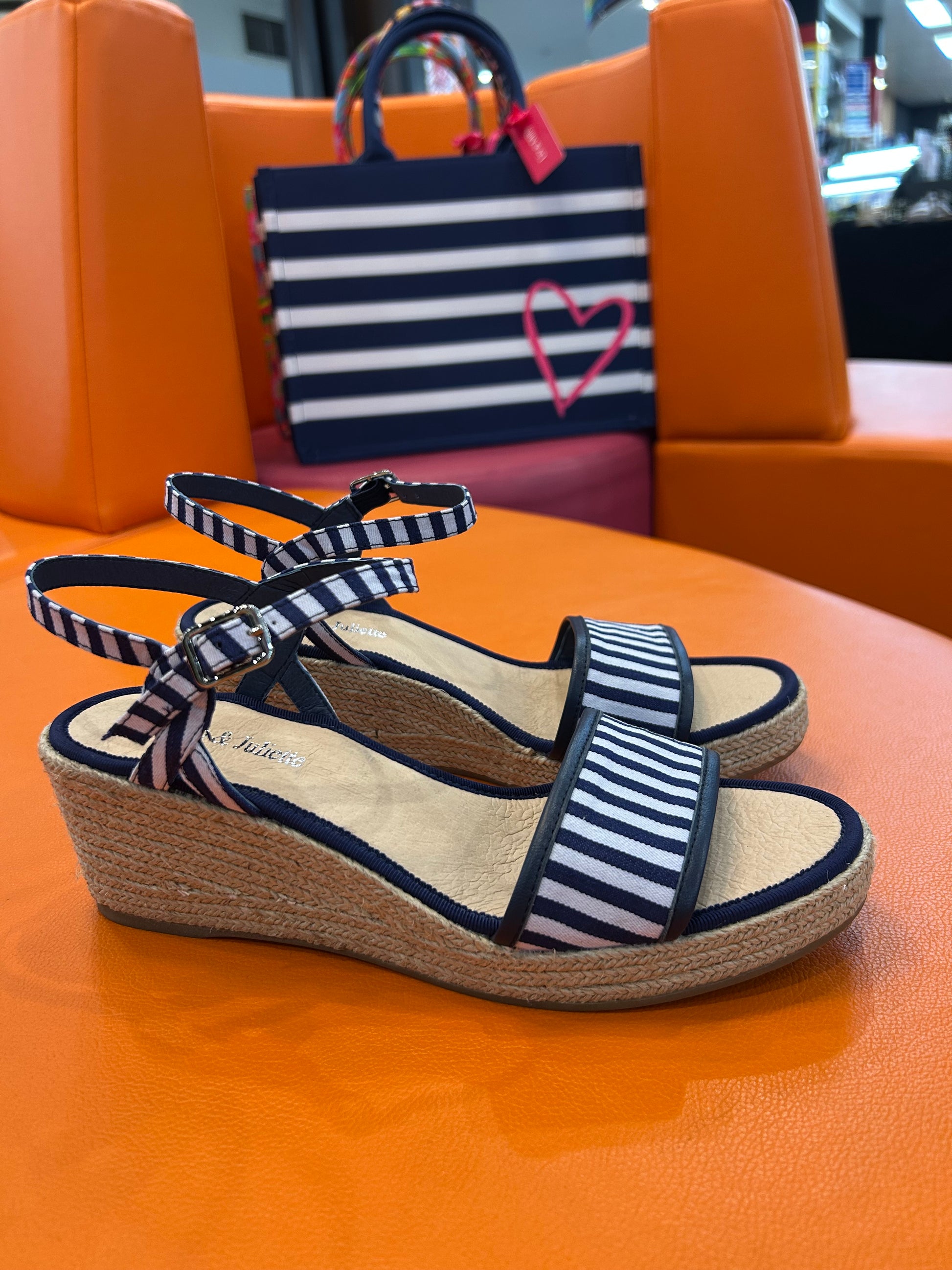 All aboard the style express! These Django & Juliette wedges in canvas navy and white stripes bring instant nautical charm. Buckle up, pair with linens or denim, and you’re sailing straight into chic. ⚓✨