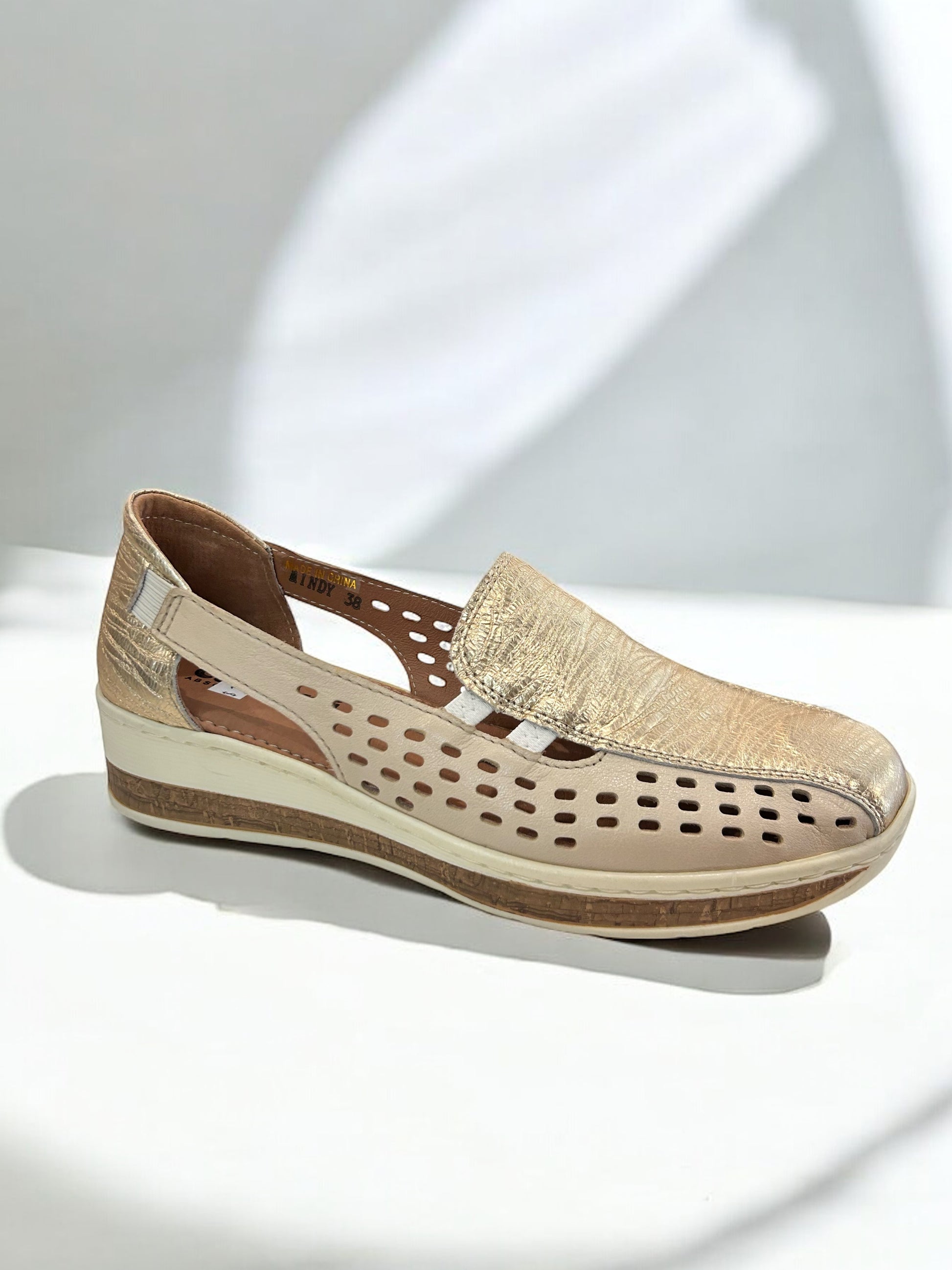 The Cassini Mindy boasts a lightweight, intelligent design perfect for the summer season. With its Slip-on style and cushioned insole, these shoes prioritize comfort. The upper features perforated leather and elasticated gussets, making for effortless entry and a stylish touch. Complete with a wedge sole with a faux cork finish, these shoes exude an air of sophistication and elegance.