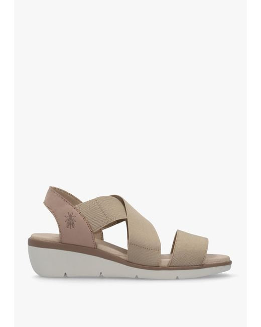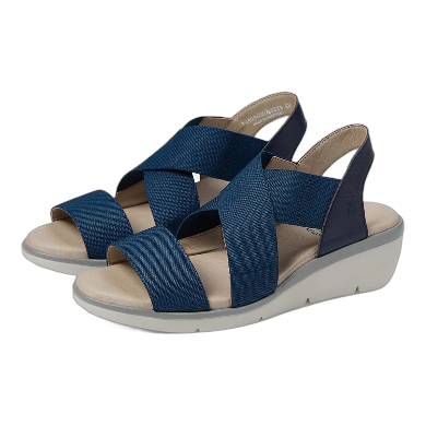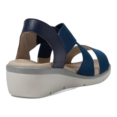 Stretchy, crisscrossing instep straps offer easy wear on a slingback sandal grounded by a cushioned footbed and modest wedge heel.