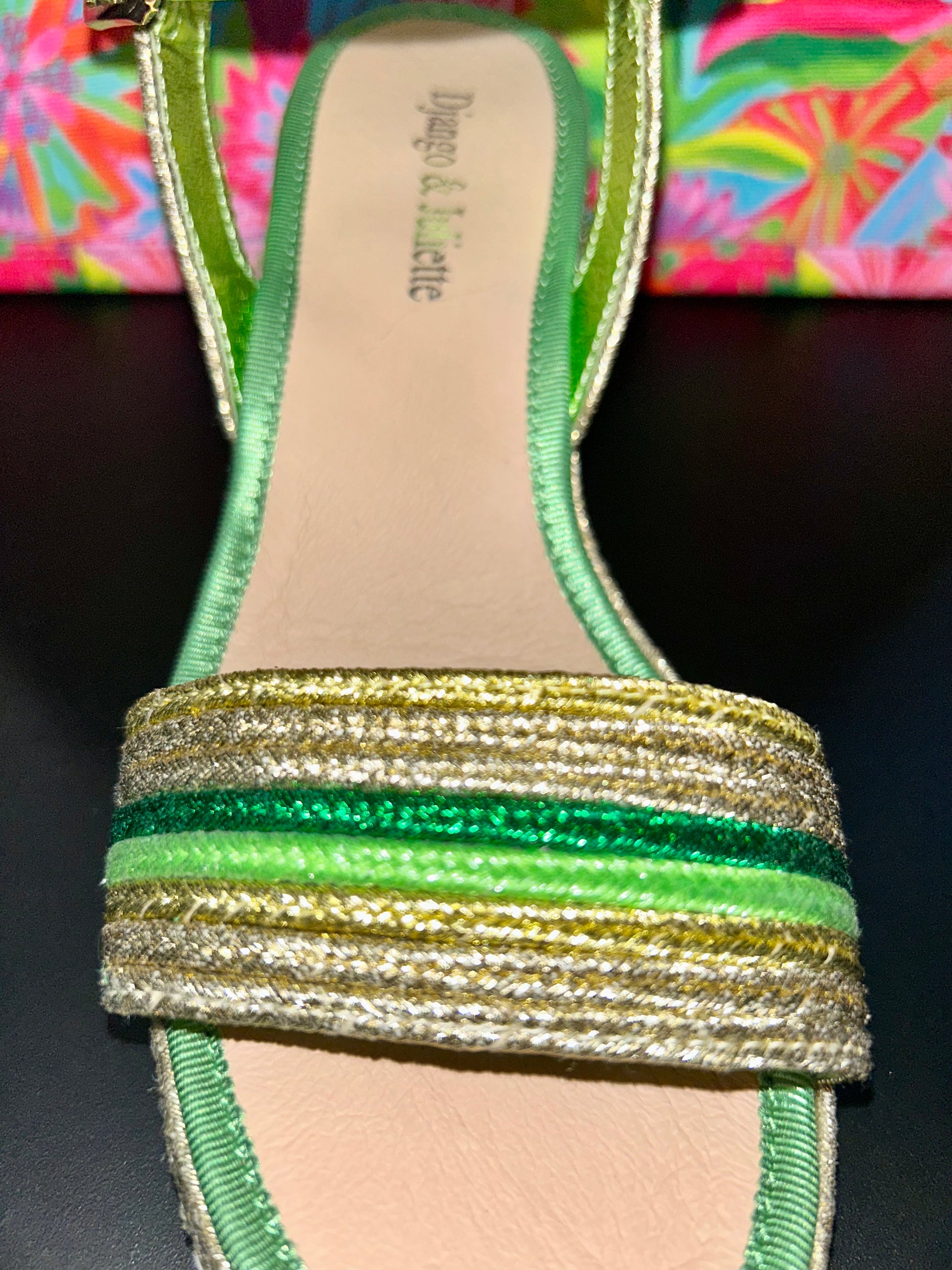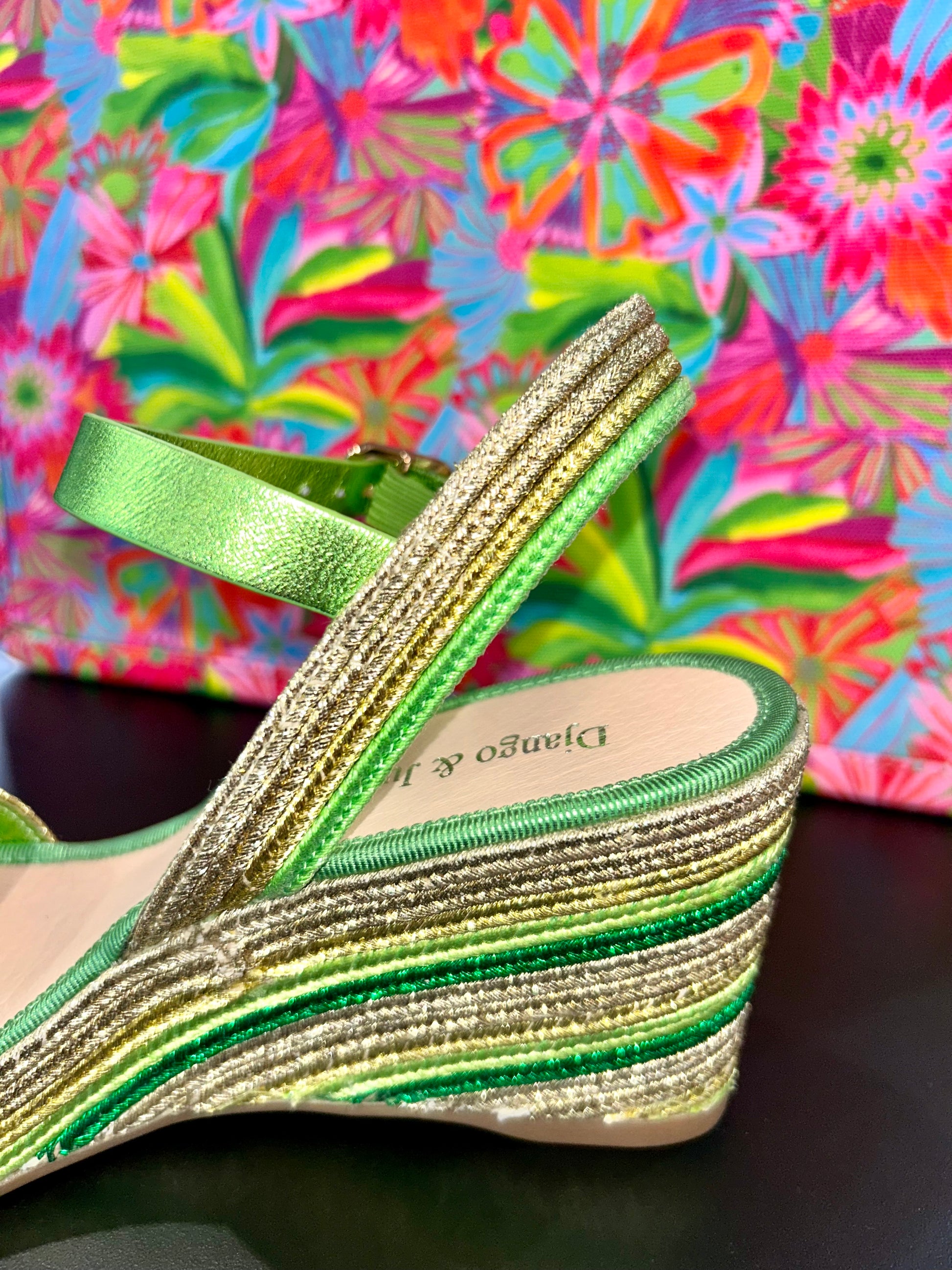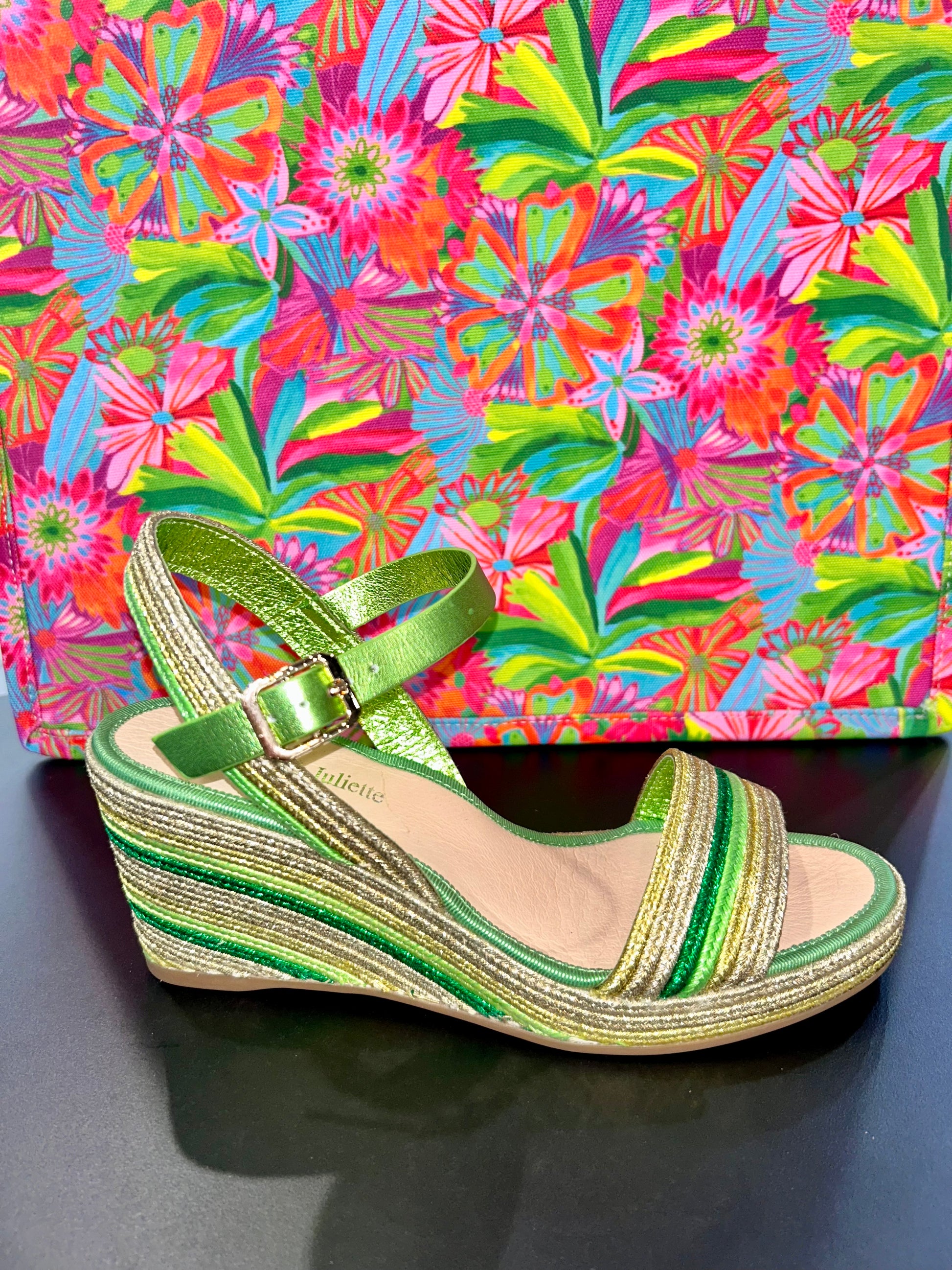 Step into statement style with Pelezet by Django & Juliette – a women’s espadrille wedge sandal in a striking electric green combo. Crafted in soft leather with metallic touches for a true metallic delight, this sandal features a secure buckled ankle strap and classic jute rope trim. The 8cm platform wedge heel gives height with comfort, making Pelezet the ultimate summer wedge sandal for beach days, city strolls, and everything in between.
