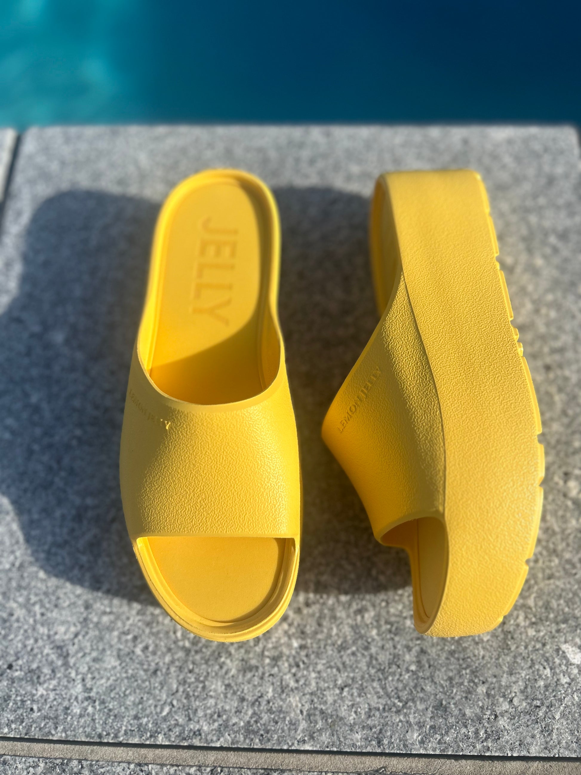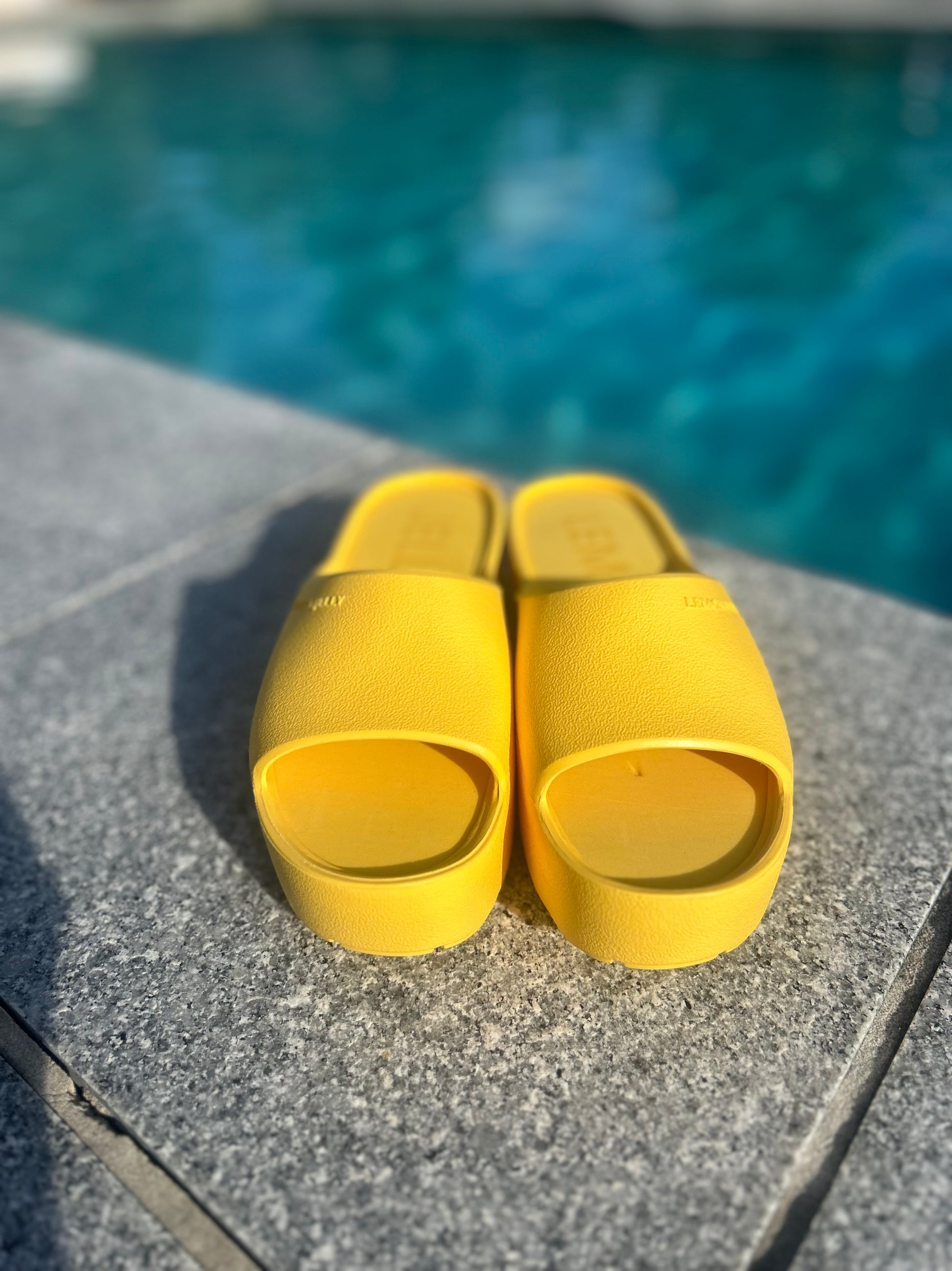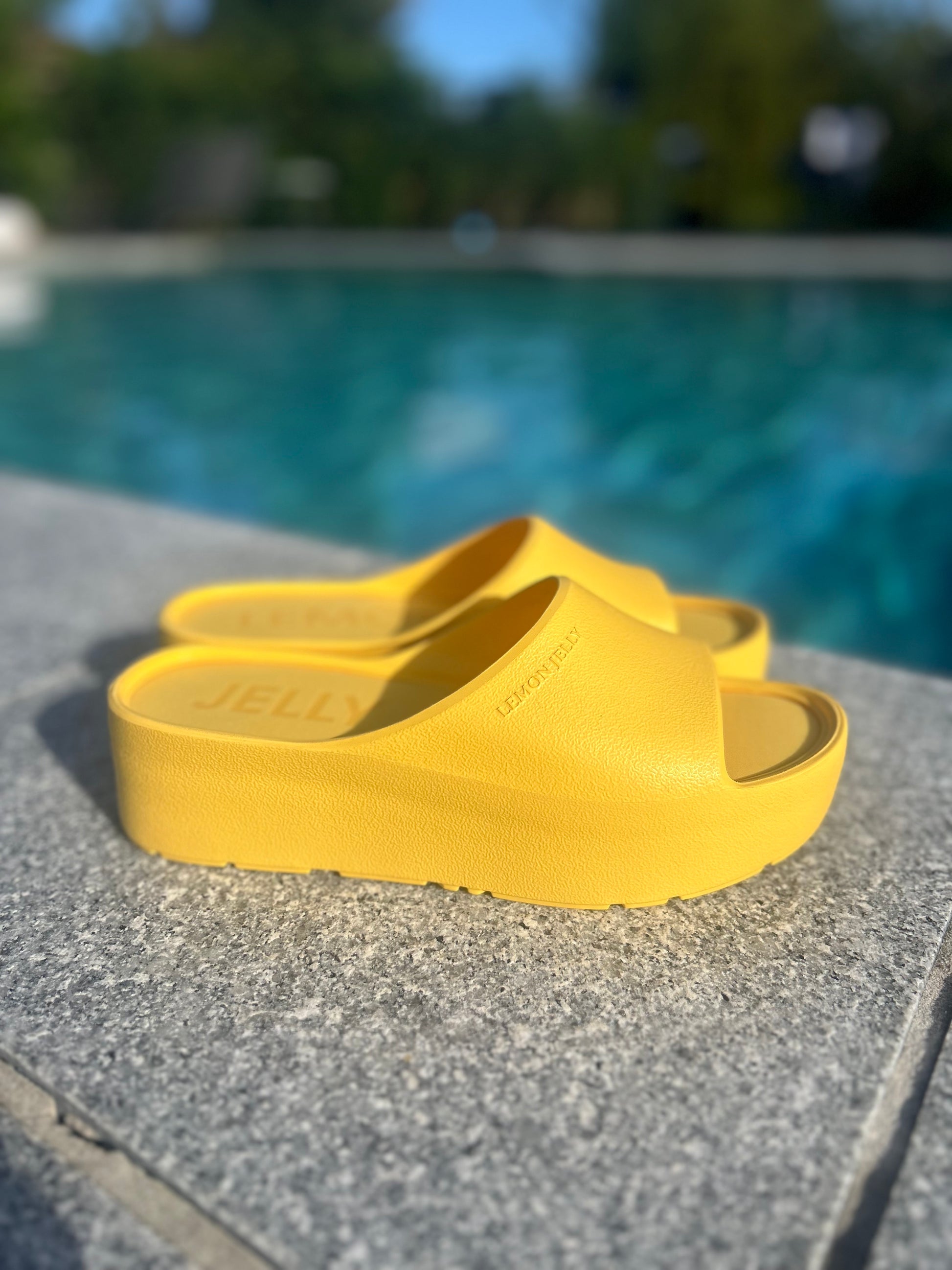The uplifting energy that comes off these yellow platform slides is contagious and fun. Match with your favourite beach outfits and good times are bound to happen. With a soft insole, light quality materials and the PETA-approved vegan stamp, comfort and style will be at your feet. Produced in Portugal, this product is the result of meticulous production within a factory powered entirely by solar energy, ensuring not only quality but also an eco-conscious approach to manufacturing.