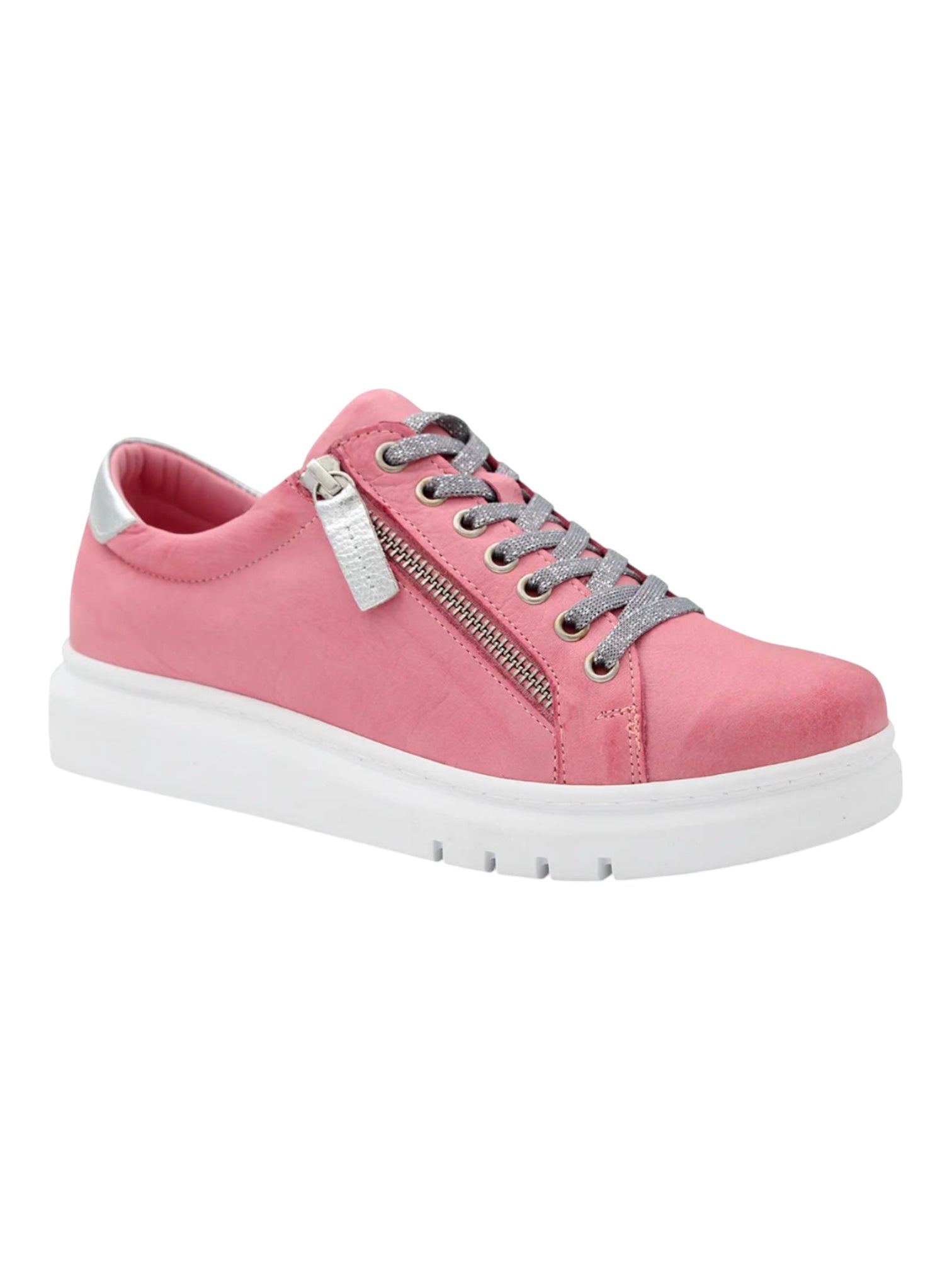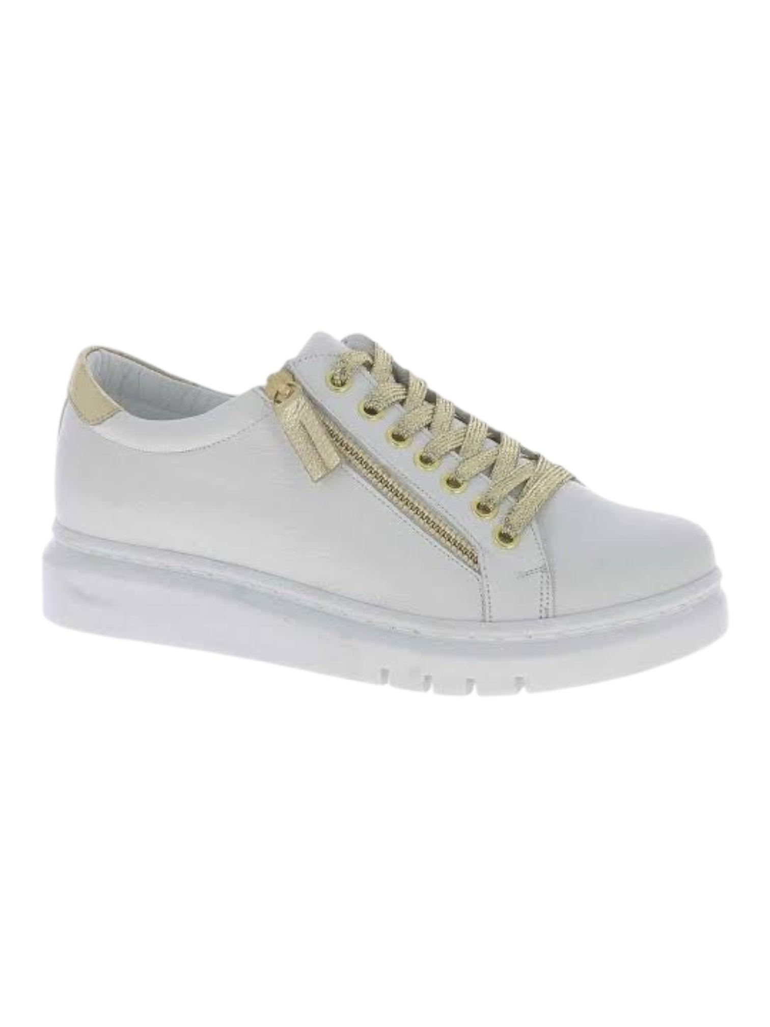 TATTER FRESH by RILASSARE presents a stylish yet comfortable sneaker crafted with a soft leather upper. Elevating the look is a white platform sole and metallic accents adorning the heel, zip and laces. With both lace-up closure and a side zip, TATTER FRESH ensures effortless on and off wear, adding convenience to its stylish appeal.