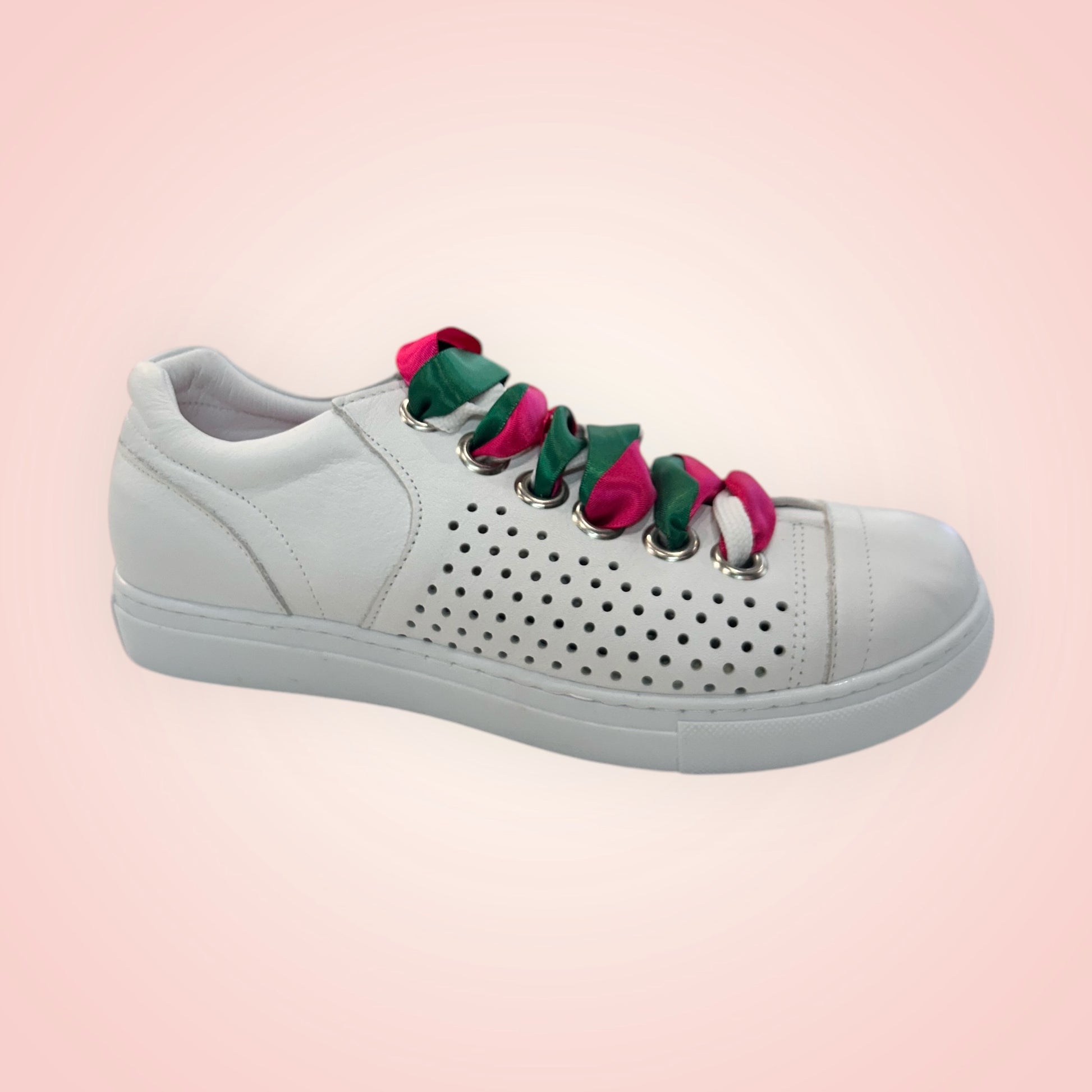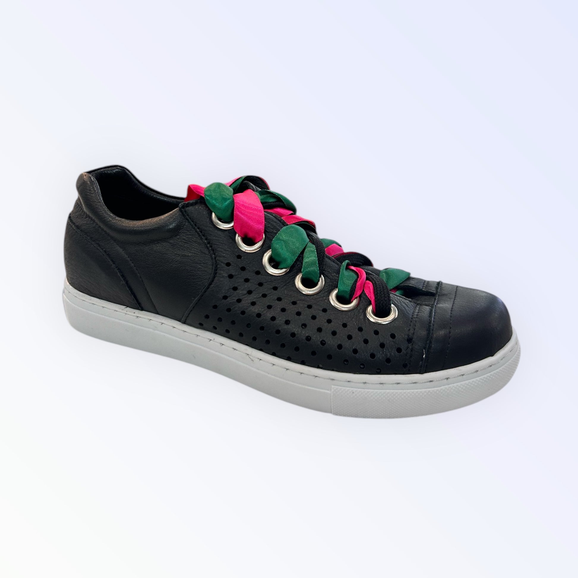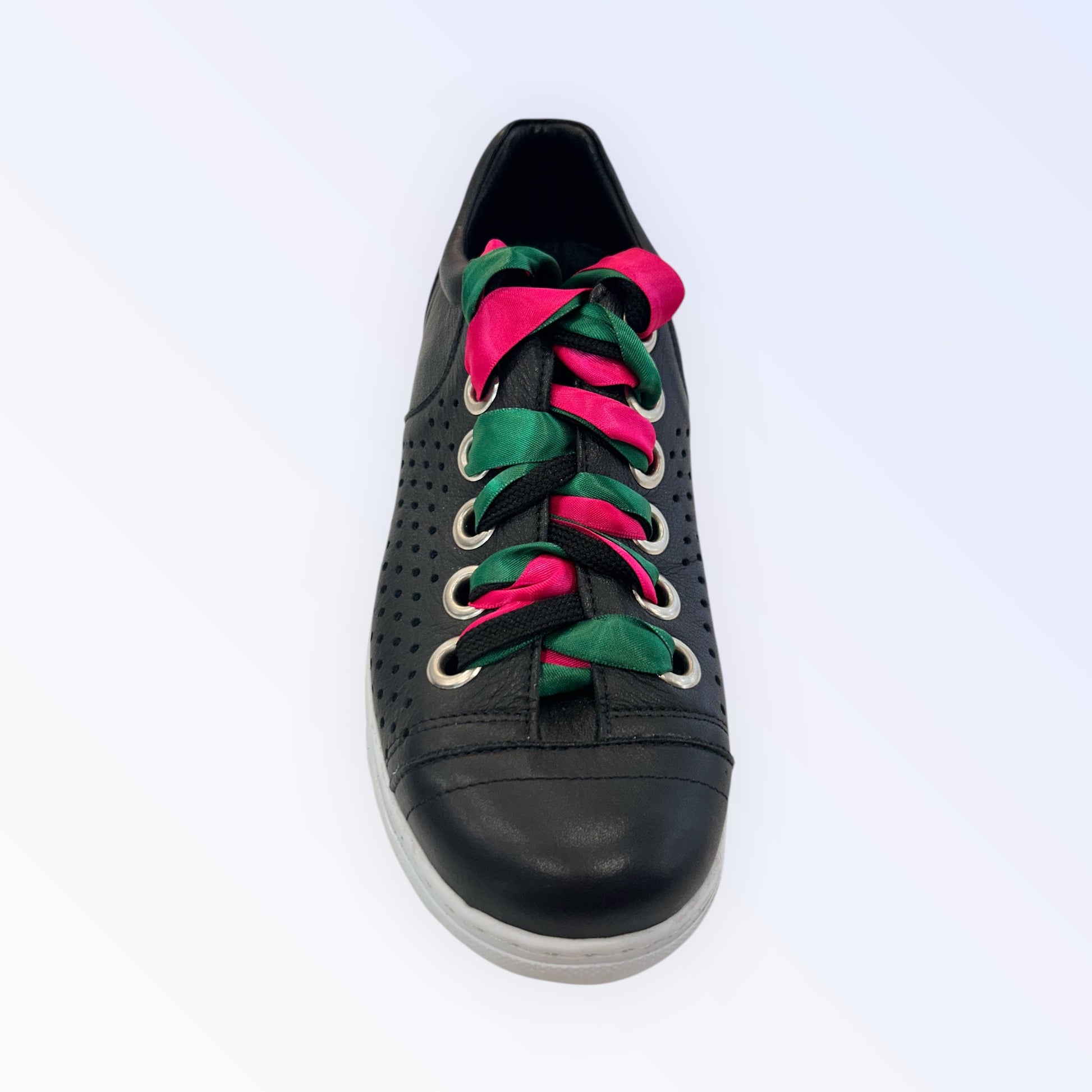 Step up your sneaker game with the Rilassare lace-up sneaker, a stylish and versatile choice for any wardrobe. This design comes with three different oversized laces, allowing you to switch up your look and add a personal touch. The lovely punched sides not only enhance the shoe's aesthetic but also provide excellent ventilation for all-day comfort. Available in classic black and white, these sneakers are crafted with care in Europe, offering premium quality and effortless style for any occasion.