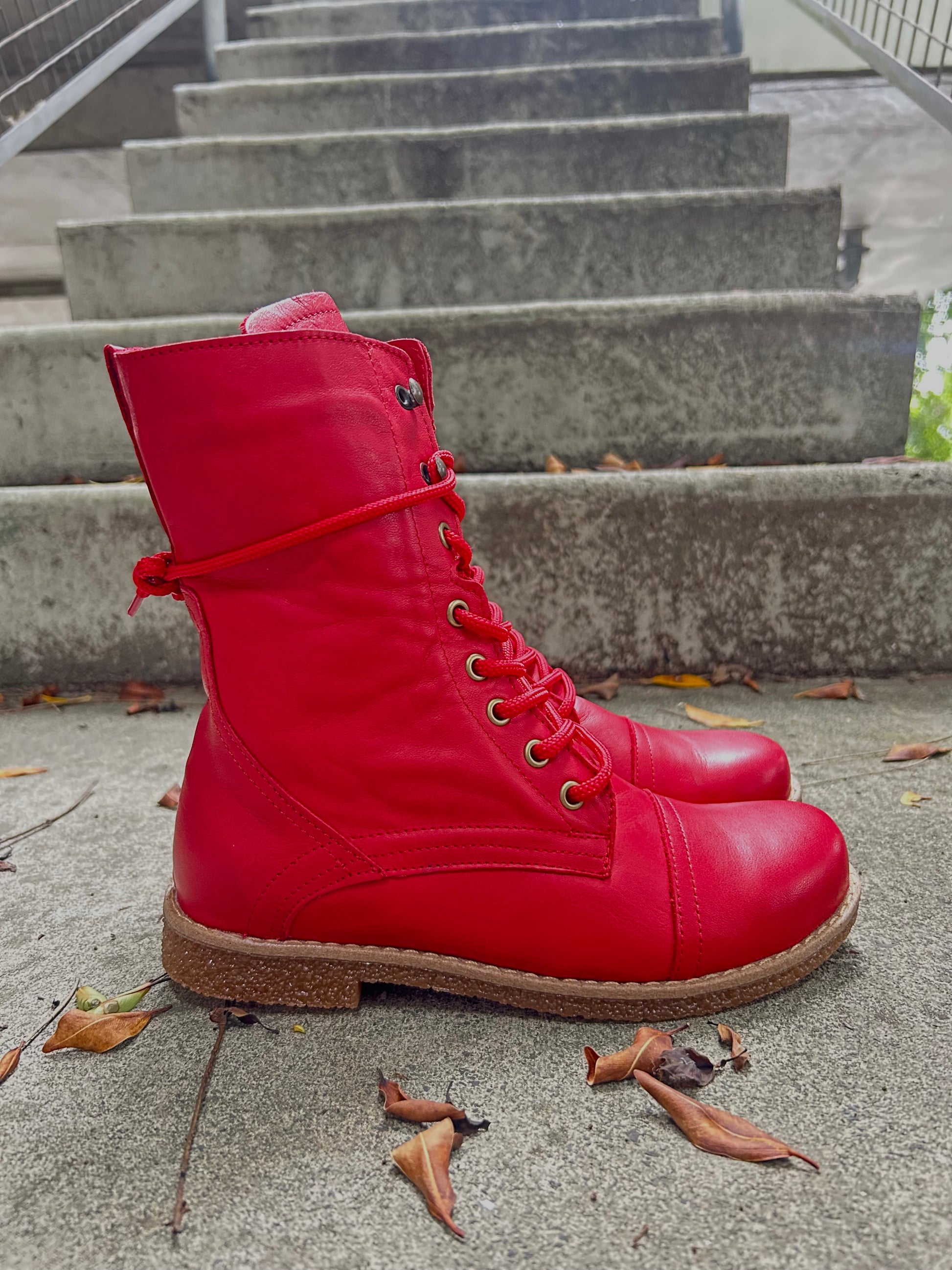 Say hello to Autumn in style with the Rilassare Tomika Combat Boot—your new standout piece this season! The bold, gorgeous red leather is sure to turn heads, adding a pop of colour to your autumn wardrobe. Designed for both comfort and practicality, the crepe sole provides unbeatable comfort and a non-slip grip, making these boots perfect for everything from crisp morning walks to weekend adventures. The internal zip means you can skip the laces every time—just zip them up and you're ready to go.