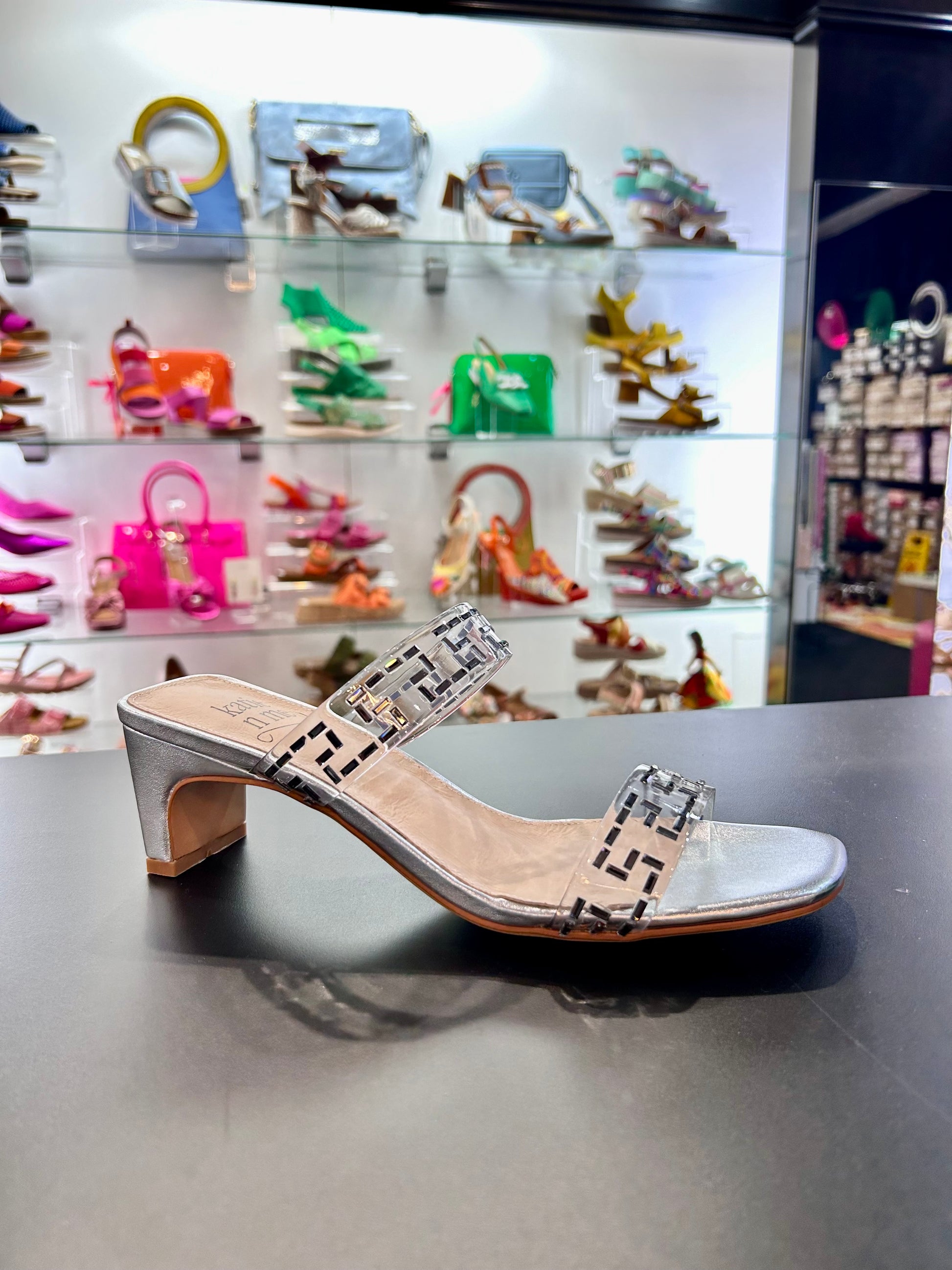 The ultimate little party slides – light on the foot, easy to slip on and finished with just the right amount of sparkle. Available in gold, black or silver, with jewel embellishments on a sleek vynalite upper that keeps the look fresh and chic. A wider base heel adds comfort, making them the perfect go-to event shoe.