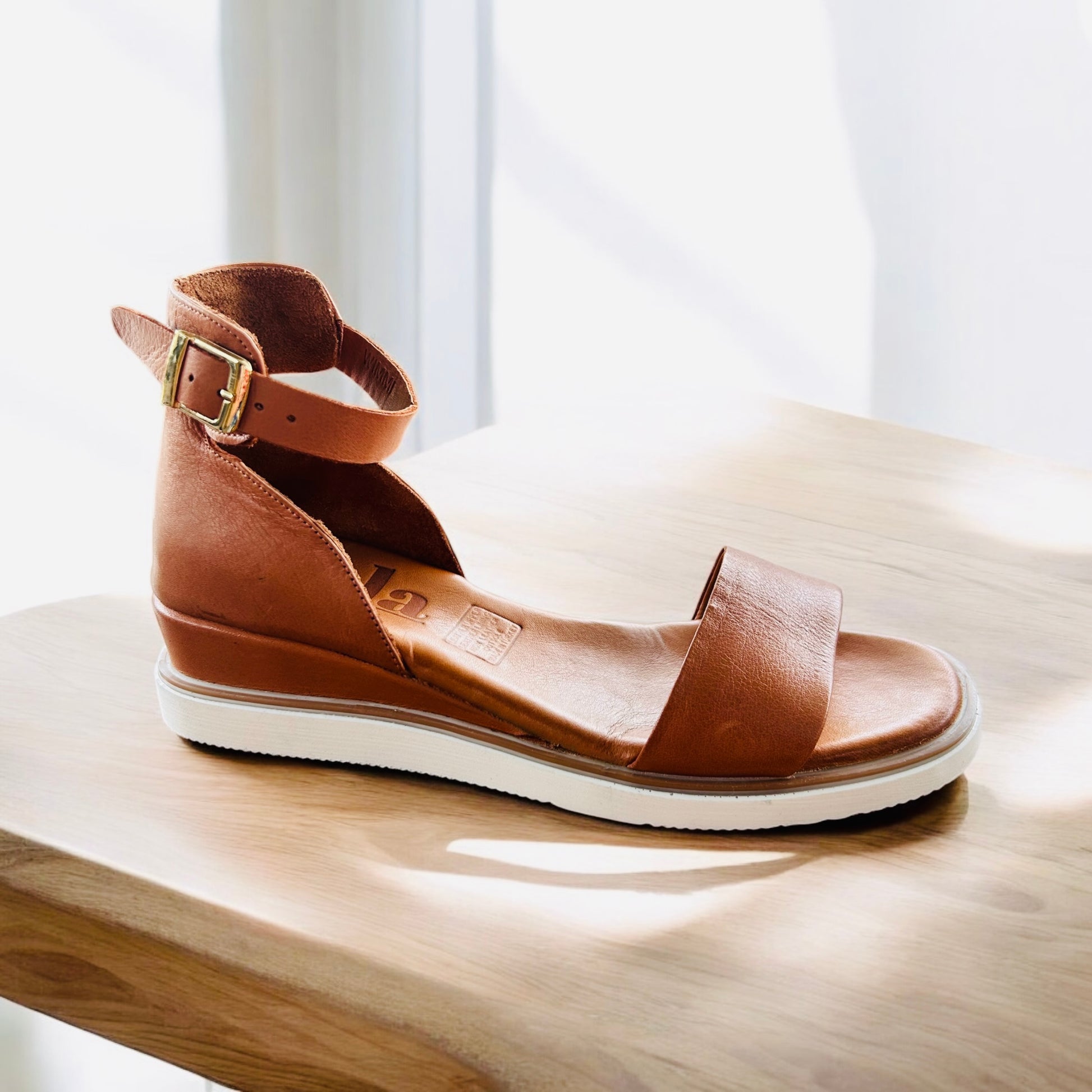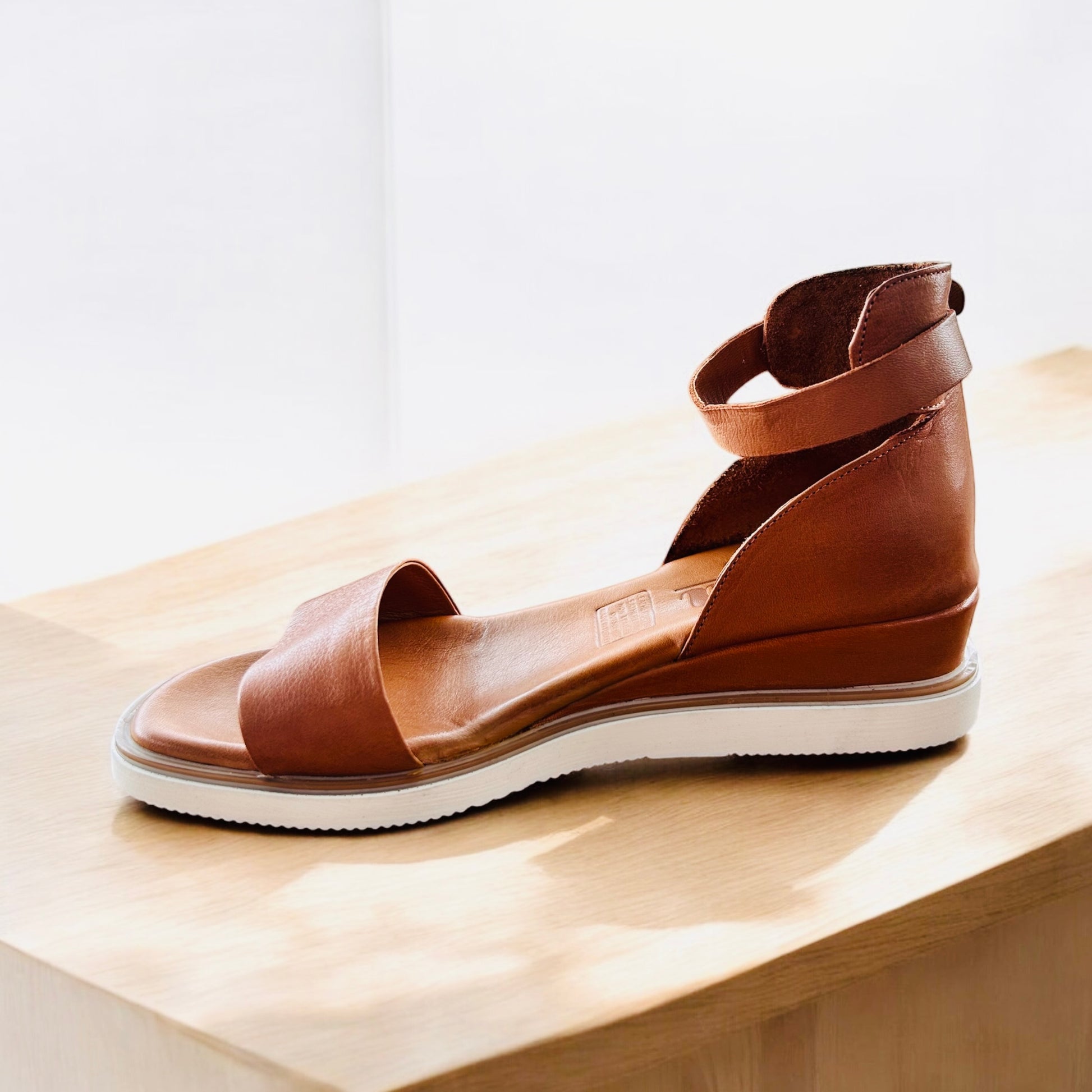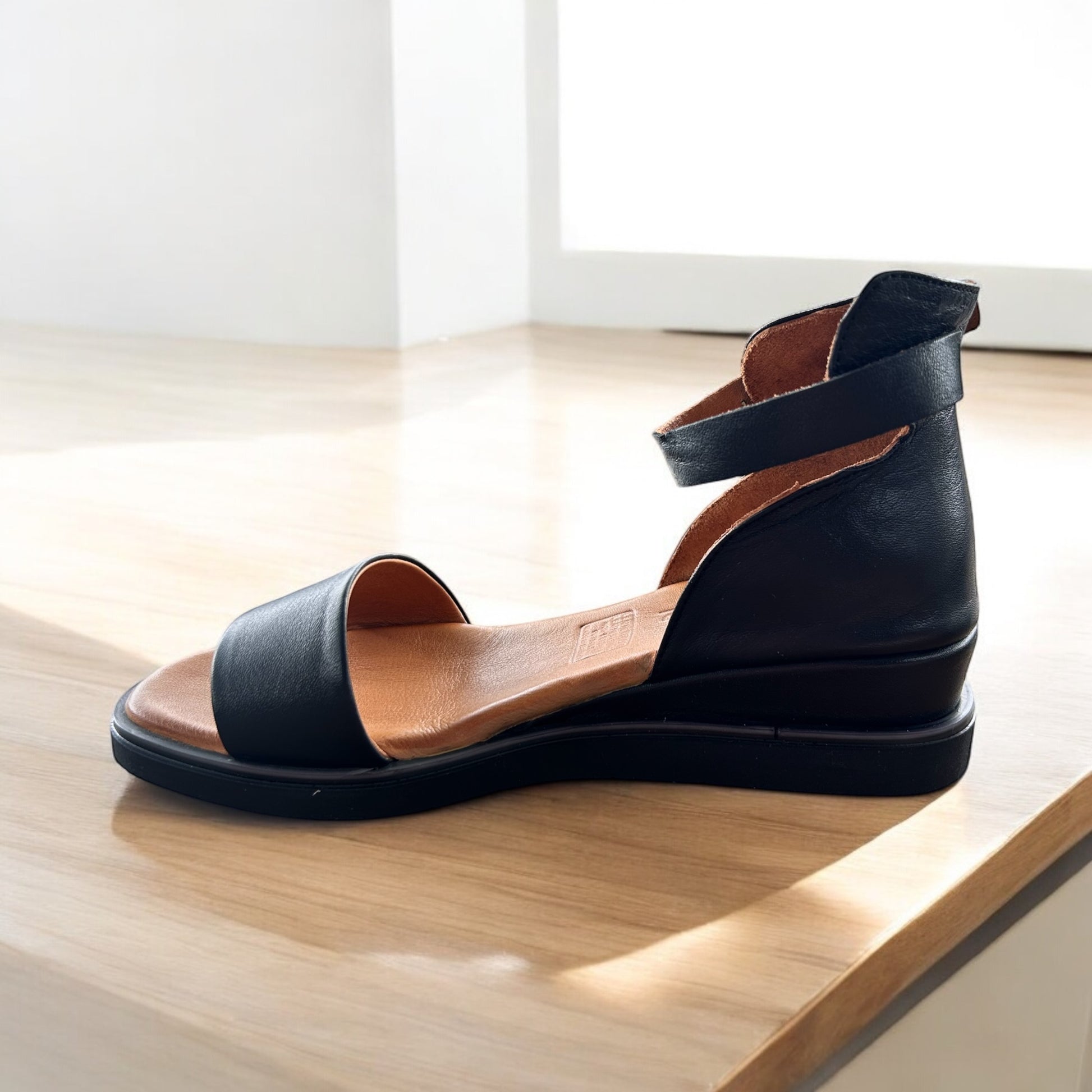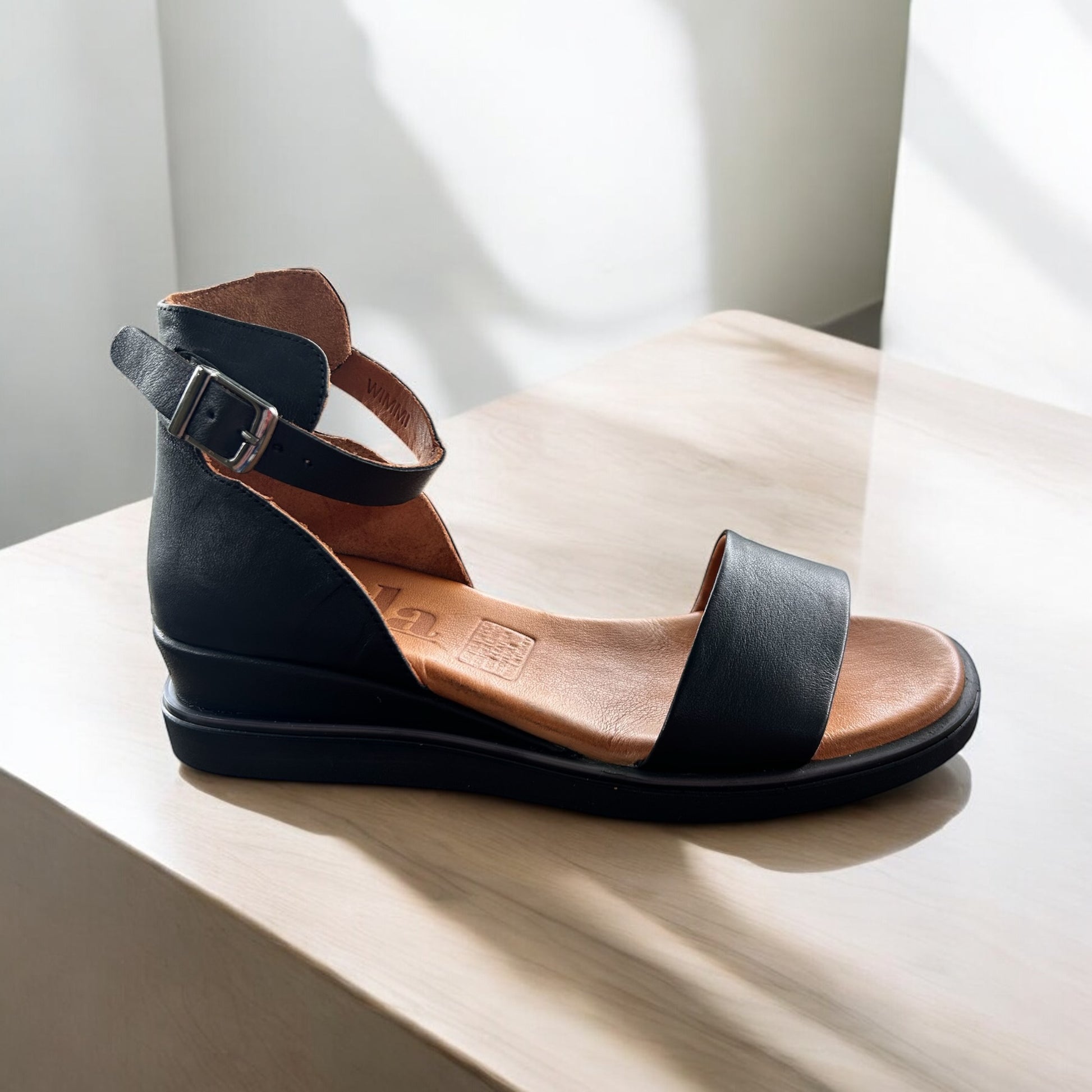 WIMMI by SALA is a minimalist women's wedge crafted from soft leather for comfort and style. The design features a simple strap across the toes, an adjustable ankle strap with a buckle for a secure fit, and a closed heel counter. Perfect for effortless summer styling, WIMMI offers a versatile look that pairs easily with casual or dressier outfits.