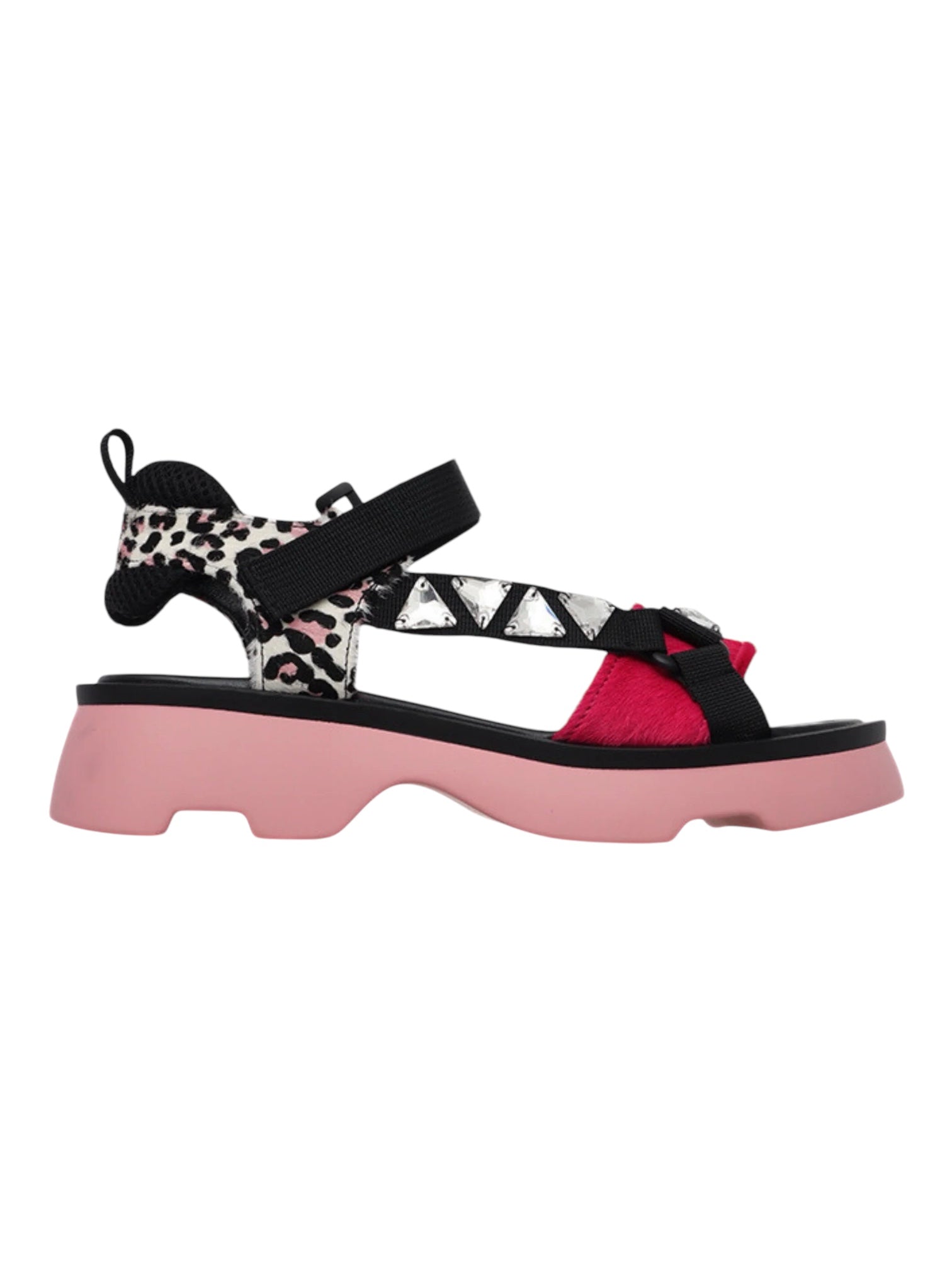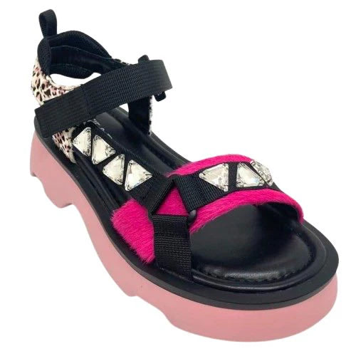 This playful and unique sandal by Alfie & Evie is a standout piece. The chunky light pink sole pairs beautifully with bold hues of hot pink, black, and a vibrant rainbow leopard print. A mix of pony hair, suede, and leather adds texture and depth, while jeweled accents bring a touch of fun. The velcro fastening not only complements the design but also makes it easy to slip on and off.