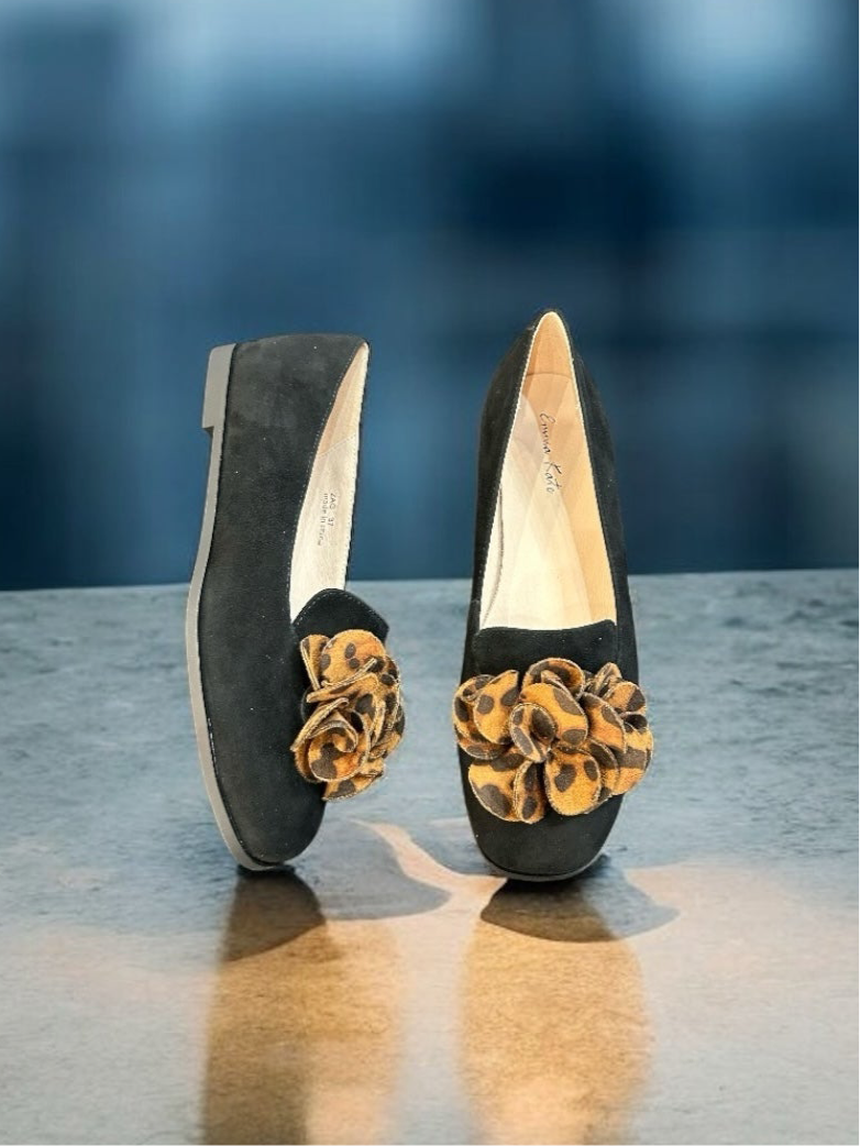 This Emma Kate ballet flat is made from soft black suede with a distinctive leopard print flower feature that adds a touch of personality to the design. With its flat profile, this shoe offers all-day comfort, while the unique floral accent brings a fun twist to an otherwise timeless look. Perfect for both casual and more refined outfits, this shoe is a statement of modern versatility and style.